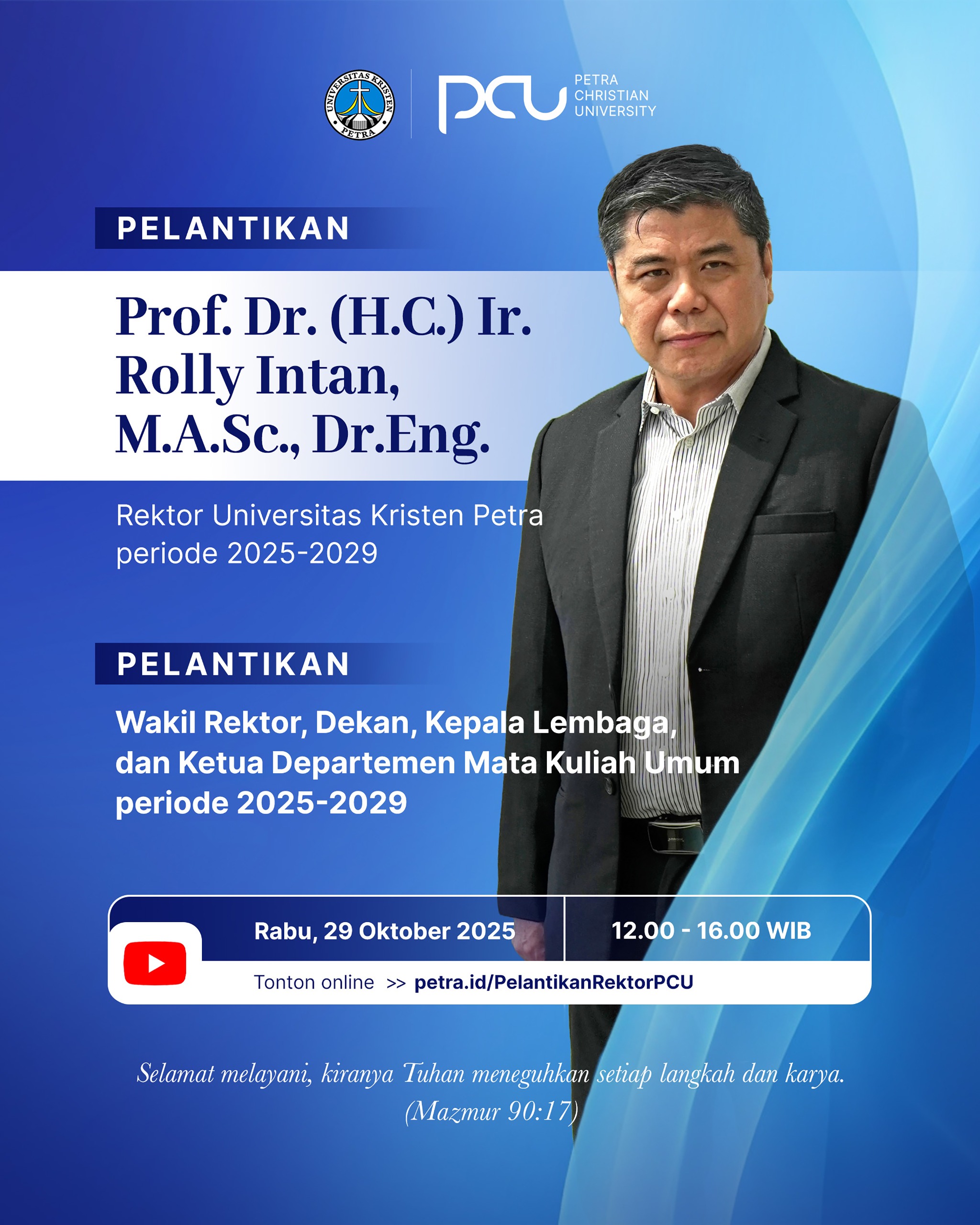 Rabu, 29 Oktober 2025 jam12.00 - 16.00 WIB bertempat di Auditorium gedung Q Universitas Kristen Petra Surabaya, akan diselenggarakan Pelantikan Prof. Dr. (H.C.) Ir., Rolly Intan, M.A.Sc., Dr.Eng. sebagai rektor UK Petra periode 2025-2029.