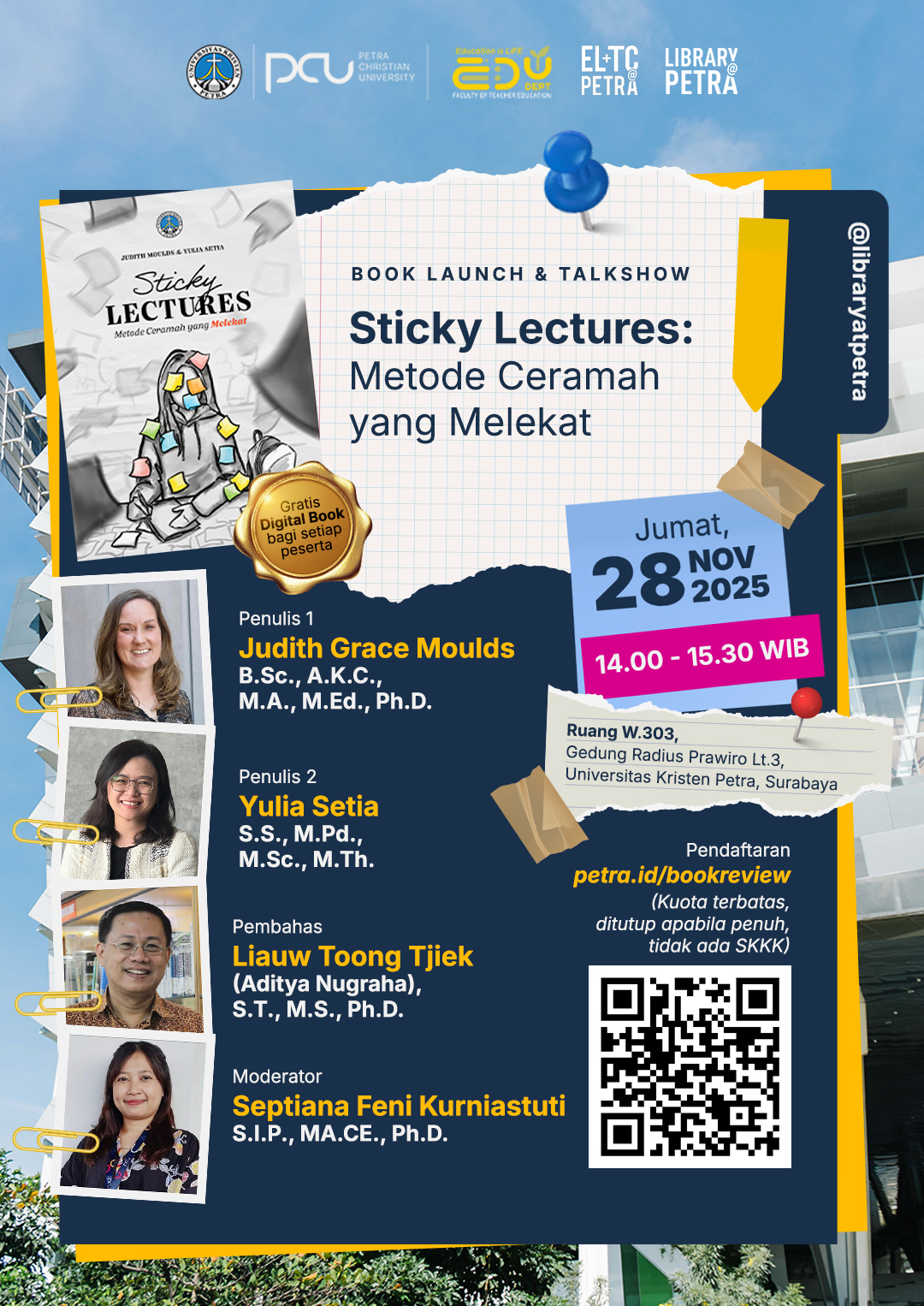 Sering kali kita metode ceramah masih menjadi metode mengajar kita di kelas. Namun sayang sekali, bukannya memaksimalkan metode tersebut, kita cenderung mengabaikannya. Temukan hasil riset bagaimana membuat metode ceramah dapat membuat materi yang kita ajarkan "melekat" pada Book Launch and Talk Show "Sticky Lectures: Metode ceramah yang Melekat.” Dapatkan insight praktis, langsung dari penulisnya dan sesi ini akan mengubah cara pandang Anda tentang metode basic yang powerful. Acara peluncuran buku dan talkshow diselenggarakan pada 28 November 2025 jam 14.00-15.30 WIB bertempat di W.303.