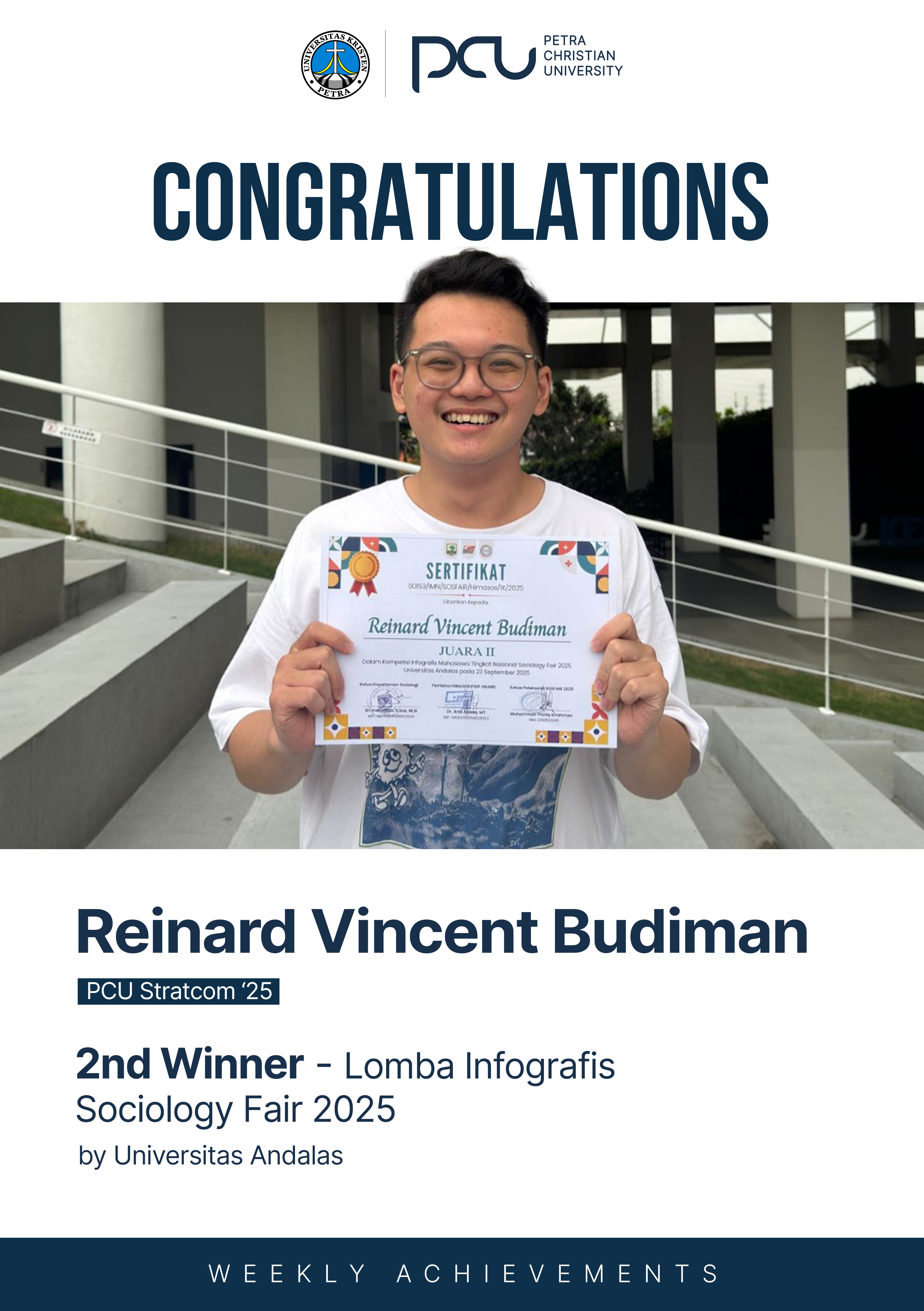 Selamat atas prestasi yang diraih oleh Reinard Vincent Budiman sebagai 2rd Winner Lomba Infografis Sociology Fair 2025 by Universitas Andalas