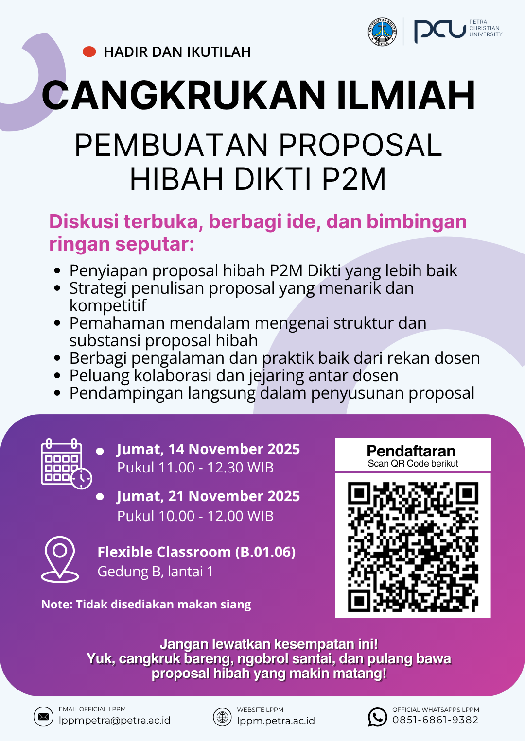 LPPM Universitas Kristen Petra Surabaya pada Jumat, 14 dan 21 November 2025 bertempat di Flexible Classroom (B.01.06) gedung B. lantai 1 UK Petra. mengadakan kegiatan Cangkrukan Ilmiah dengan mengangkat topik Pembuatan Proposal Hibah Dikti P2M. Di dalam acara ini juga diselenggarakan diskusi terbuka, berbagi ide dan bimbingan ringan seputar penyiapan proposal hibah P2M Dikti yang lebih baik, serta strategi penulisan proposal yang menarik dan kompetitif, dan yang lainnya yang berhubungan dengan hibah Dikti P2M.