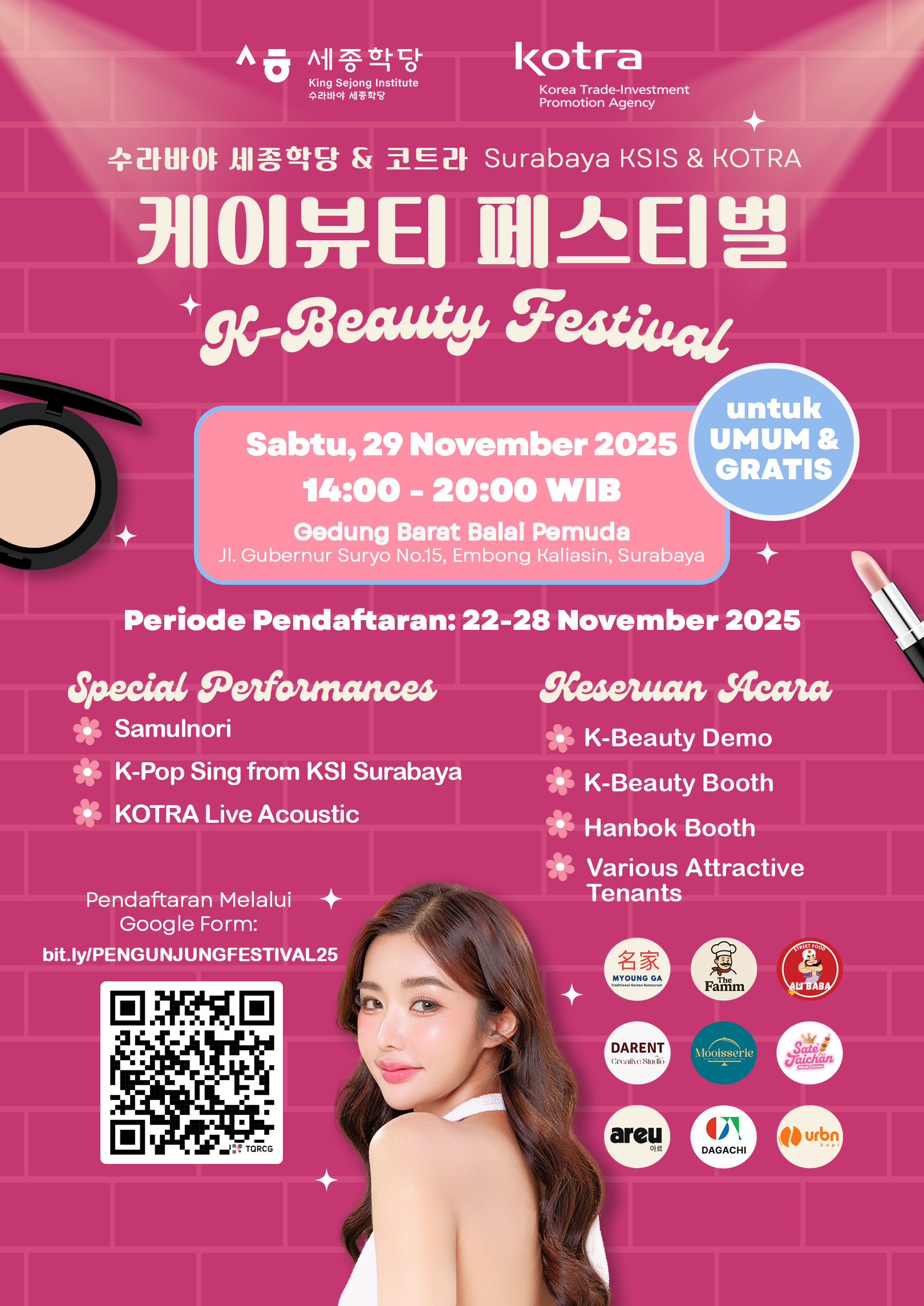 “K-Beauty Festival”Suatu event budaya yang merupakan hasil kerjasama KSI Surabaya dengan KOTRA (Korea Trade-Investment Promotion Agency) untuk memperkenalkan budaya dan bahasa Korea melalui acara festival.Dalam acara Korean Beauty Festival ini akan ada beberapa booth yaitu: