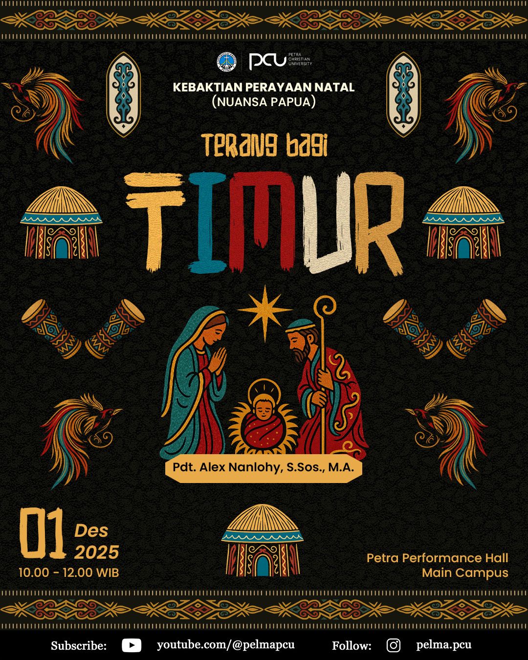 Kebaktian Natal 2025 akan diselenggarakan oleh Universitas Kristen Petra Surabaya pada 01 Desember 2025, jam 10.00 - 12.00 WIB bertempat di Petra Performance Hall kampus tengah UK Petra. Mengangkat tema Terang bagi Timur. Dengan pengkhotbah Pdt. Alex Nanlohy, S.Sos., M.A.