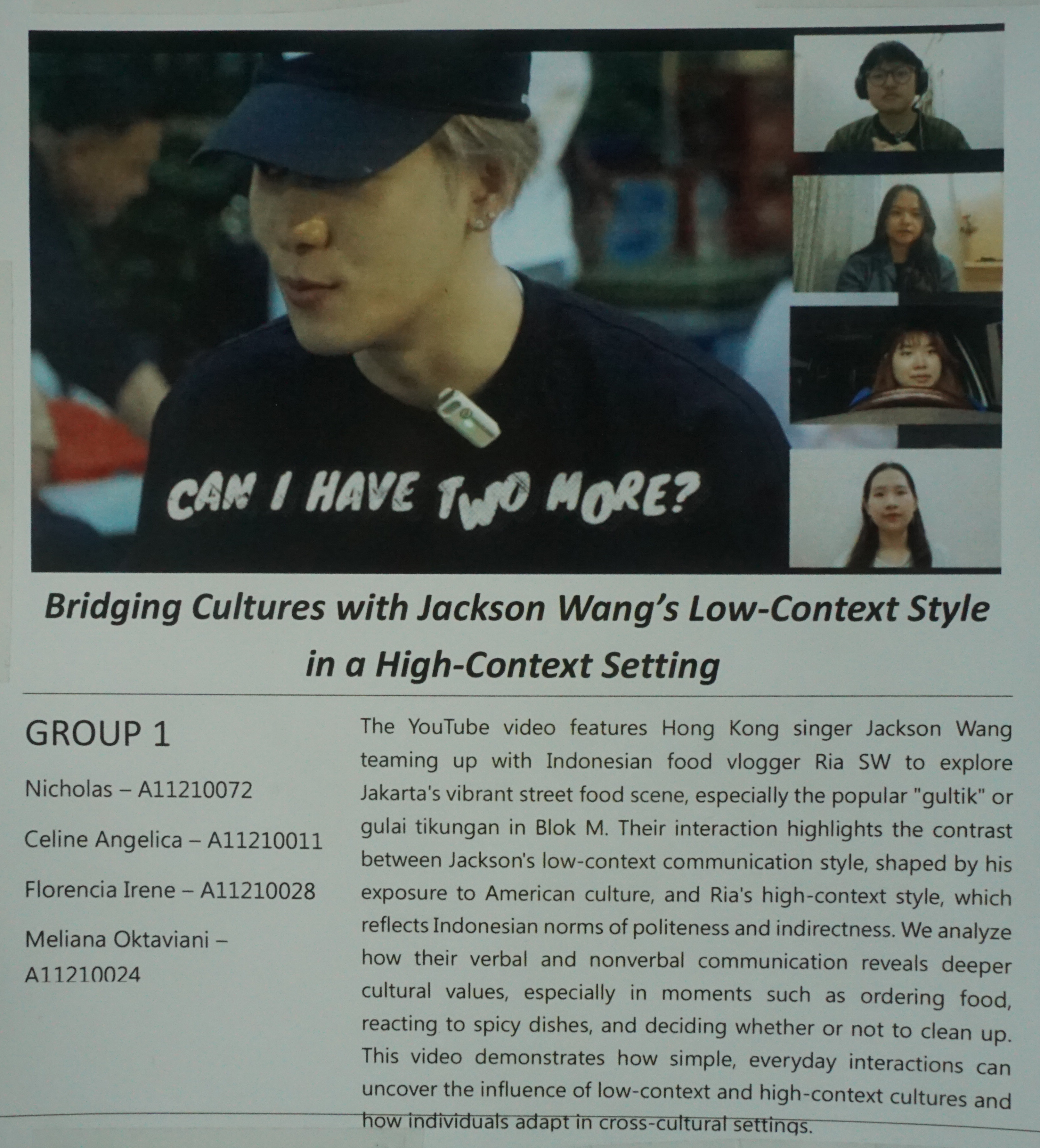 Poster ini dibuat untuk final project exhibition dari mahasiswa Program Studi English for Creative Industry. Salah satu materi pameran adalah Bridging cultures with Jackson Wang's low-context style in a high-context setting.