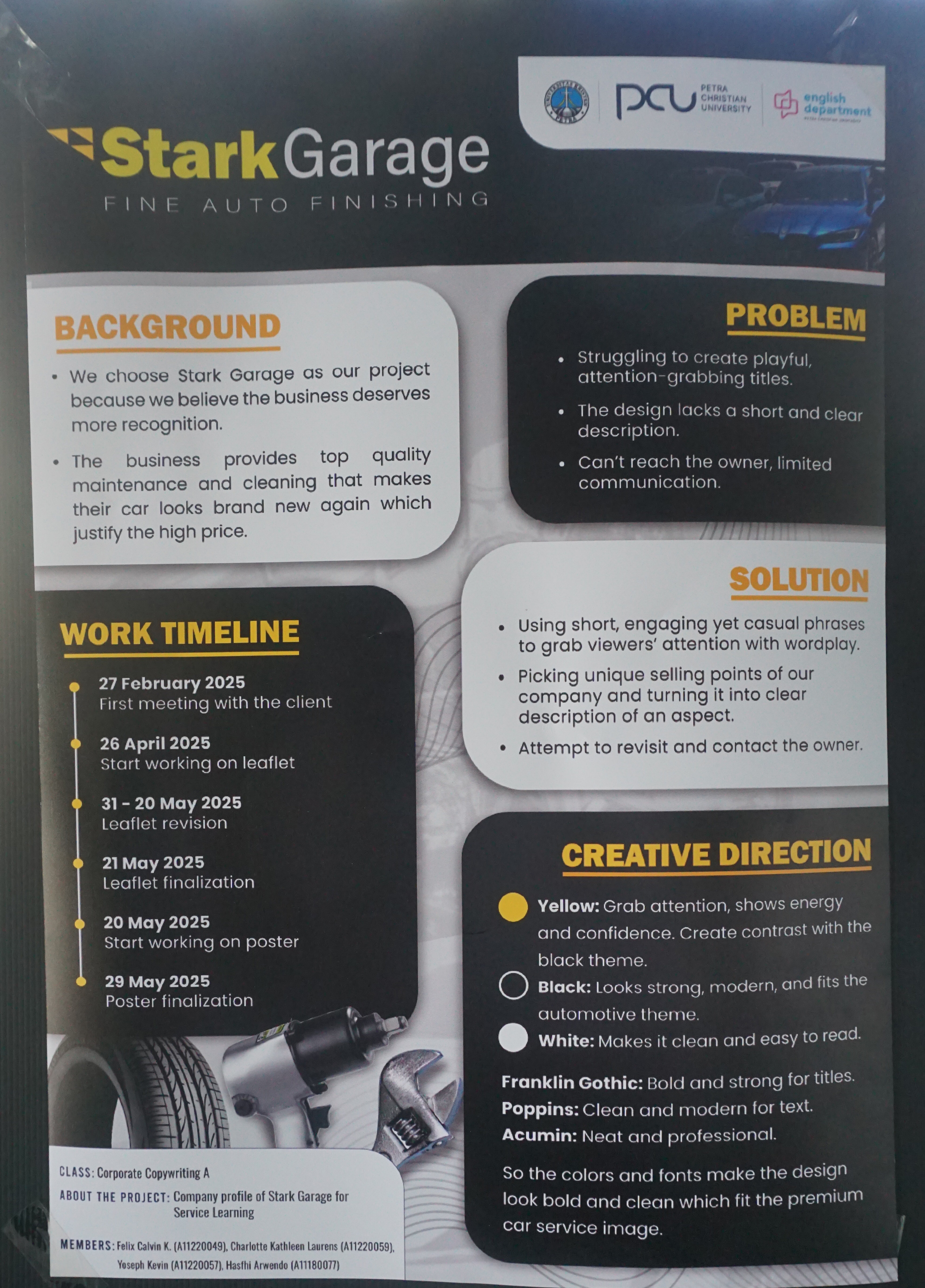 Poster ini dibuat untuk final project exhibition dari mahasiswa Program Studi English for Creative Industry. Salah satu materi pameran adalah Company Profile Stark Garage