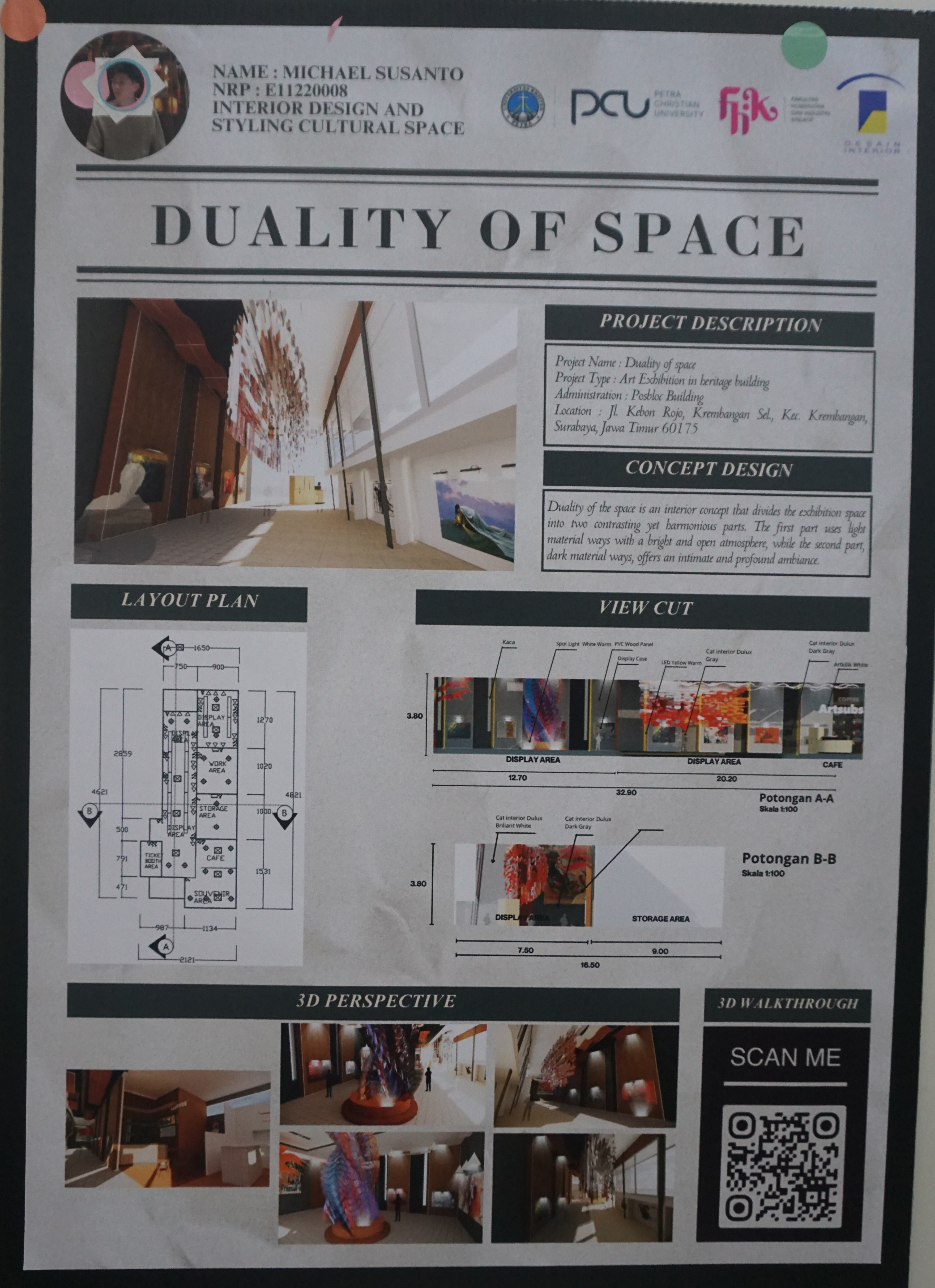 Dalam rangka menyemarakkan 27 tahun Prodi Desain Interior diselenggarakan seminar Insight bersama alumni dan pengguna lulusan, serta rangkaian acara IDE+ (Interior Design Exhibition and Workshop) 18-20 Juni 2025 yang menyajikan berbagai karya mata kuliah Personal Space, Presentasi Visual, Interior Design for Workspace, Furniture Design for Workspace, Interior Design for Cultural Space, Interior Product Design For Cultural Space, Craft and Furnishing, dan LEAP Final Project. Dalam pameran IDE+ tahun ini disajikan pula hasil karya kolaborasi project based learning Prodi Desain Interior PCU - UCSI dan UiTM. Salah satu materi pameran ini ialah Duality of space: interior design and styling cultural space. Karya Michael Susanto (E11220008).