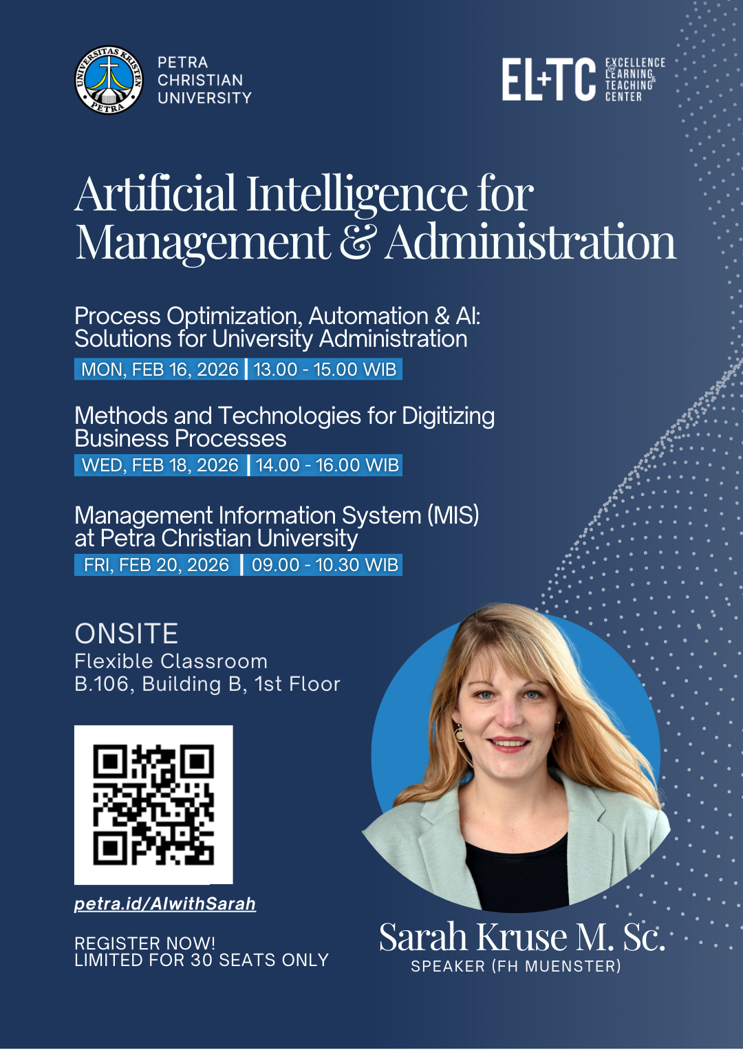Pusat Pengembangan Pembelajaran (ELTC) Universitas Kristen Petra Surabaya mengadakan seminar tentang Artificial Intelligence for Management & Administration dengan narasumber Sarah Kruse, M.Sc. Ada 3 topik yang diselenggarakan pada tanggal 16, 18, 20 Februari 2026.