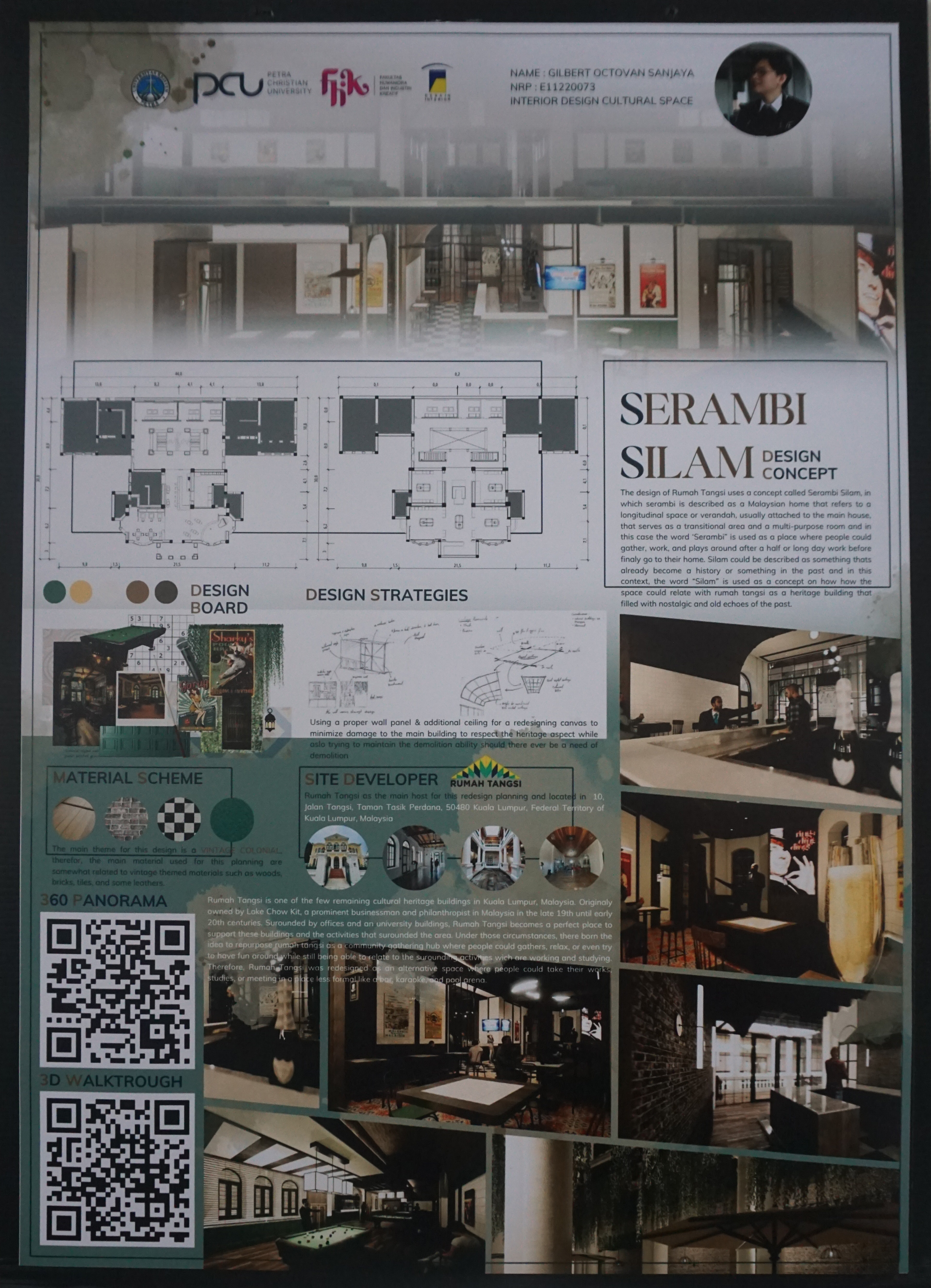 Dalam rangka menyemarakkan 27 tahun Prodi Desain Interior diselenggarakan seminar Insight bersama alumni dan pengguna lulusan, serta rangkaian acara IDE+ (Interior Design Exhibition and Workshop) 18-20 Juni 2025 yang menyajikan berbagai karya mata kuliah Personal Space, Presentasi Visual, Interior Design for Workspace, Furniture Design for Workspace, Interior Design for Cultural Space, Interior Product Design For Cultural Space, Craft and Furnishing, dan LEAP Final Project. Dalam pameran IDE+ tahun ini disajikan pula hasil karya kolaborasi project based learning Prodi Desain Interior PCU - UCSI dan UiTM. Salah satu materi pameran ini ialah Serambi Silam: interior design cultural space. Karya Gilbert Octovan Sanjaya (E11220073).