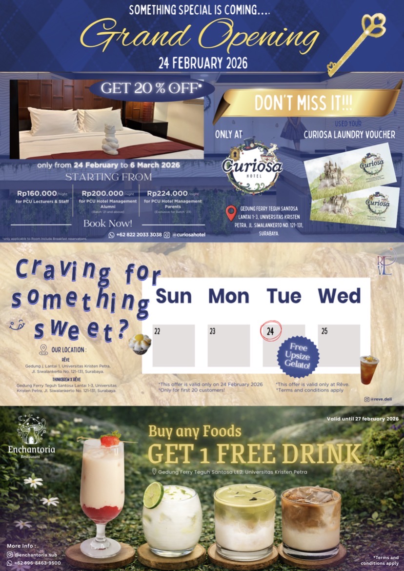 Untuk meningkatkan kemampuan dan ketrampilan dalam manajemen hotel, maka Program Manajemen Perhotelan mengadakan praktek dengan membuka program Curiosa Hotel. Grand opening dibuka pada tanggal 24 Februari 2026.