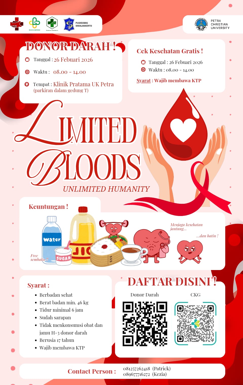 Unit Poliklinik UK Petra pada 26 Februari 2026, menyelenggarkan Donor Darah dan Cek Kesehatan gratis.......Untuk pelaksanaan kegiatan ada di Poliklinik Gedung T Universitas Kristen Petra.