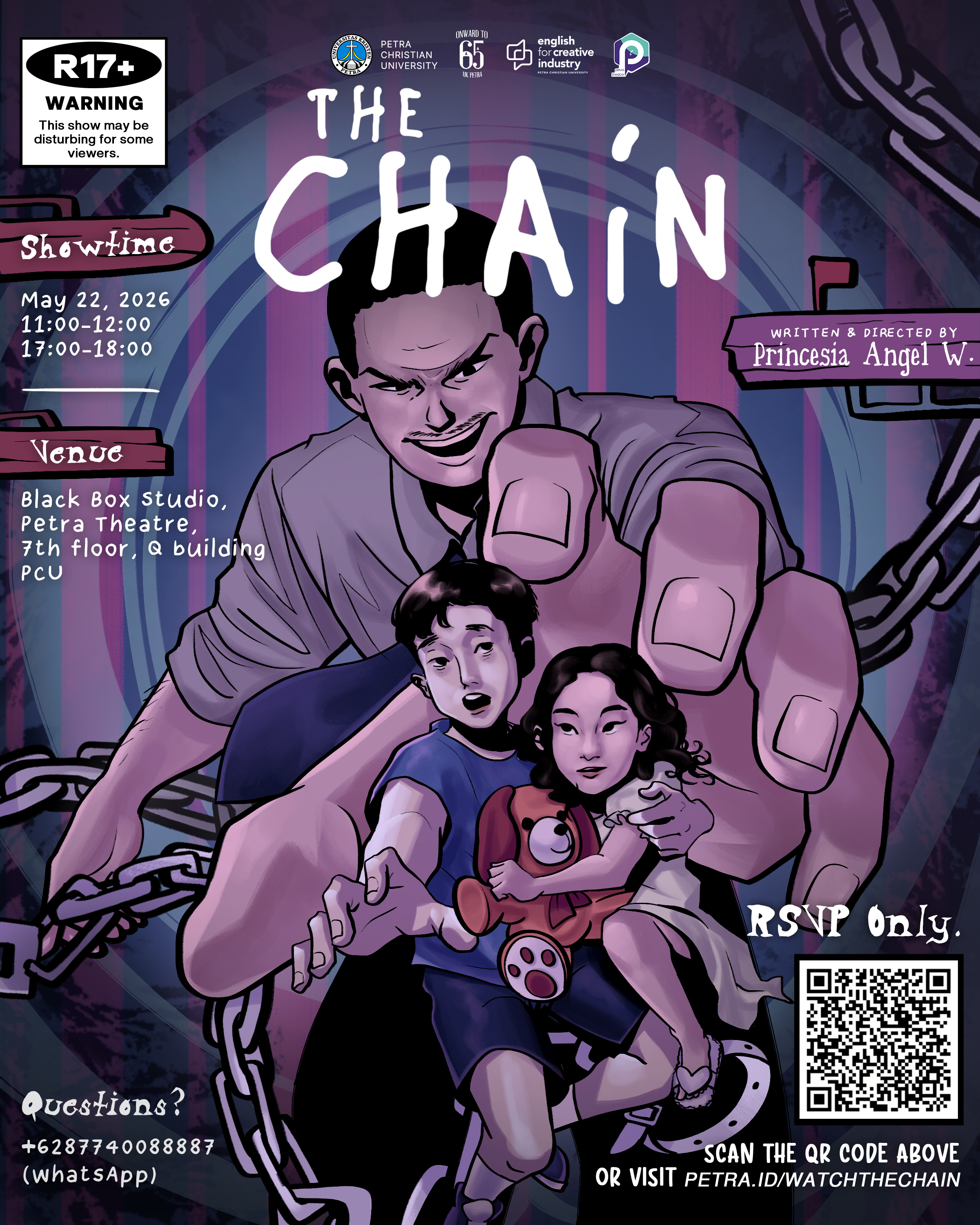 The Chain mengandung tema kekerasan terhadap anak dan trauma keluarga. Kebijaksanaan penonton sangat dianjurkan. Setelah pertunjukan, akan diadakan sesi diskusi mengenai tema yang diangkat dalam pementasan ini.