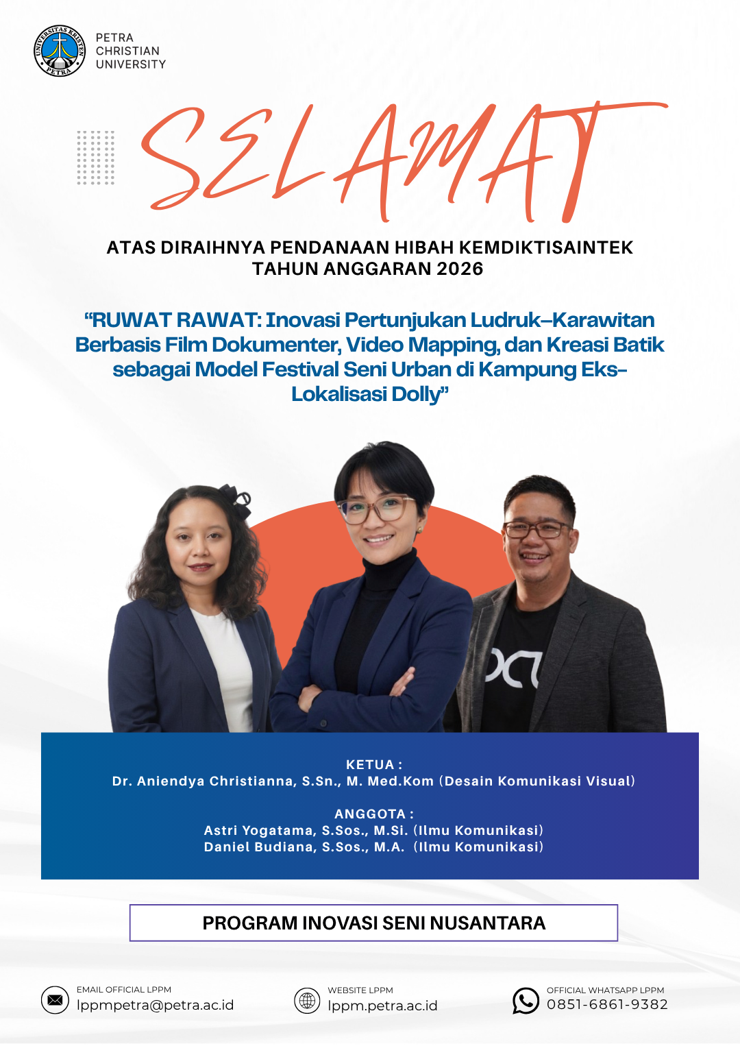 Ucapan selamat atas prestasi yang diraih oleh Dr. Aniendya Christiana, S.Sn., M.Med.Kom., serta Astri Yogatama, S.Sos., M.Si. dan Daniel Budiana, S.Sos., M.A. sebagai penerima pendanaan hibah Kemdiktisaintek tahun anggaran 2026, dengan skema Program Inovasi Seni Nusantara.