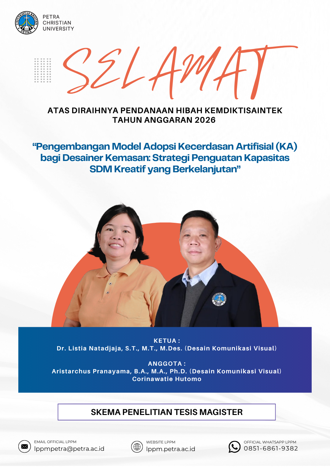 Ucapan selamat atas prestasi yang diraih oleh Dr. Listia Natadjaja, S.T., M.T., dan Aristarchus Pranayama, B.A., M.A., Ph.D. dan Corinawatie Hutomo sebagai penerima pendanaan hibah Kemdiktisaintek tahun anggaran 2026, dengan skema Penelitian Tesis Magister.