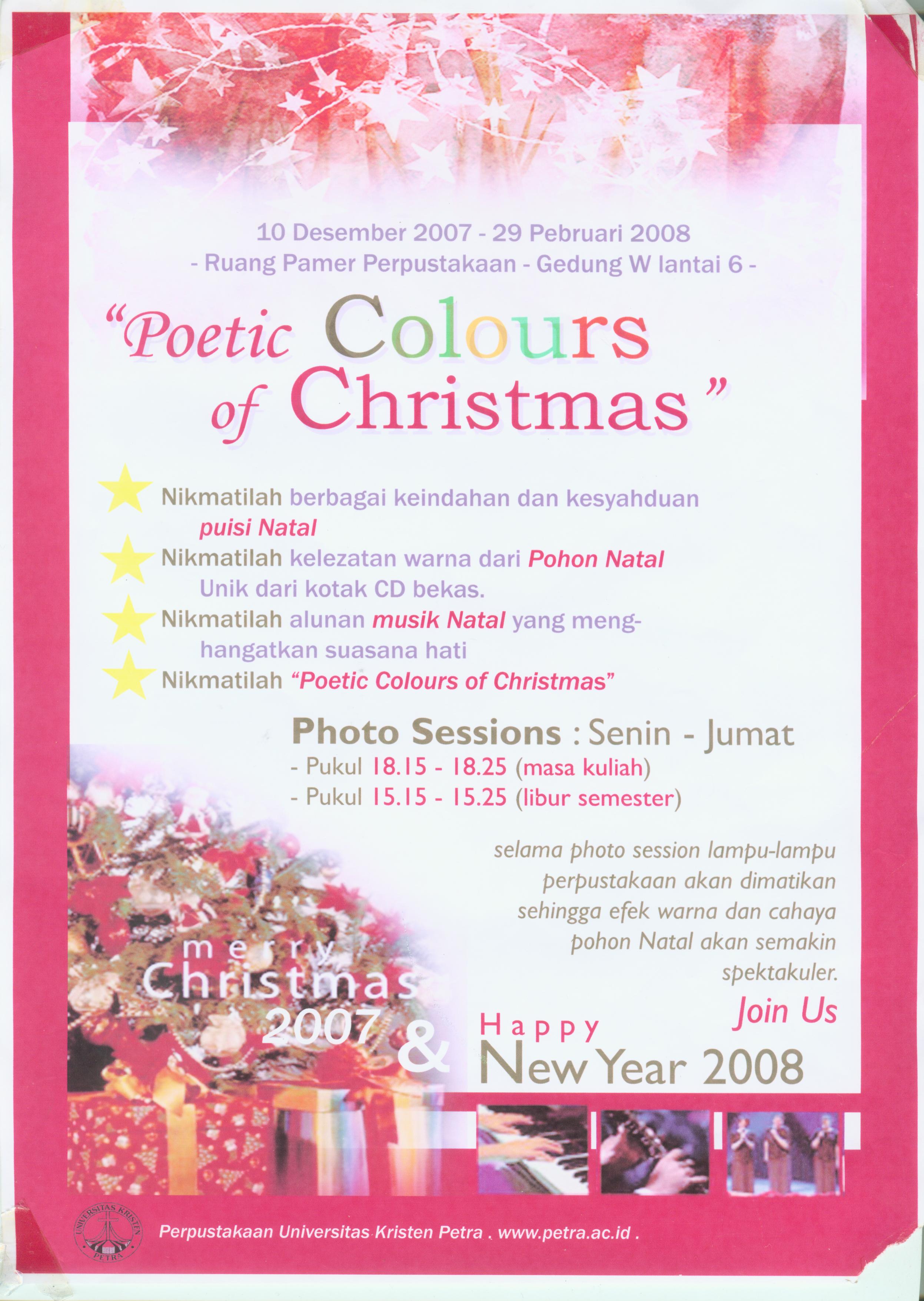 Untuk menyambut hari Natal tahun 2007, Perpustakaan UK Petra mempersiapkan berbagai keindahan dan kesyahduan puisi Natal dengan alunan musik Natal yang menghangatkan suasana hati. Di ruang pamer Perpustakaan, tersedia 1 pohon natal unik ysng terbuat dari kotak=kotak CD bekas. Tema ini akan dilaksanakan mulai 10 Desember 2007 hingga 29 Februari 2008.