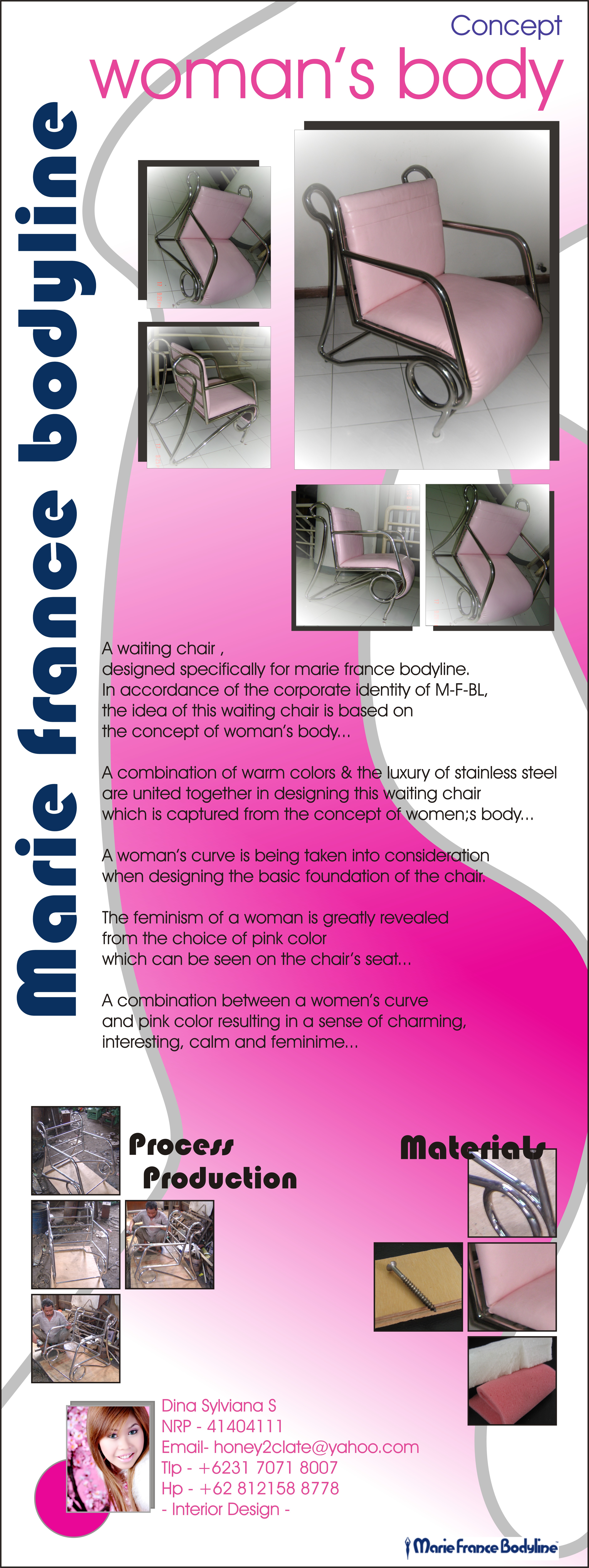 Konsep perancangan kursi tunggu Marine France Bodyline adalah women's body. Feminin dalam pengertian lembut, sifat wanita, gemulai. Bentuk seperti lekuk tubuh wanita. Warna soft, pink. Struktur menggunakan sandaran tangan dan punggung. Tekstur lembut. Material yang dipilih adalah: stainless (rangka) finishing, spon dan kain oscar pink.