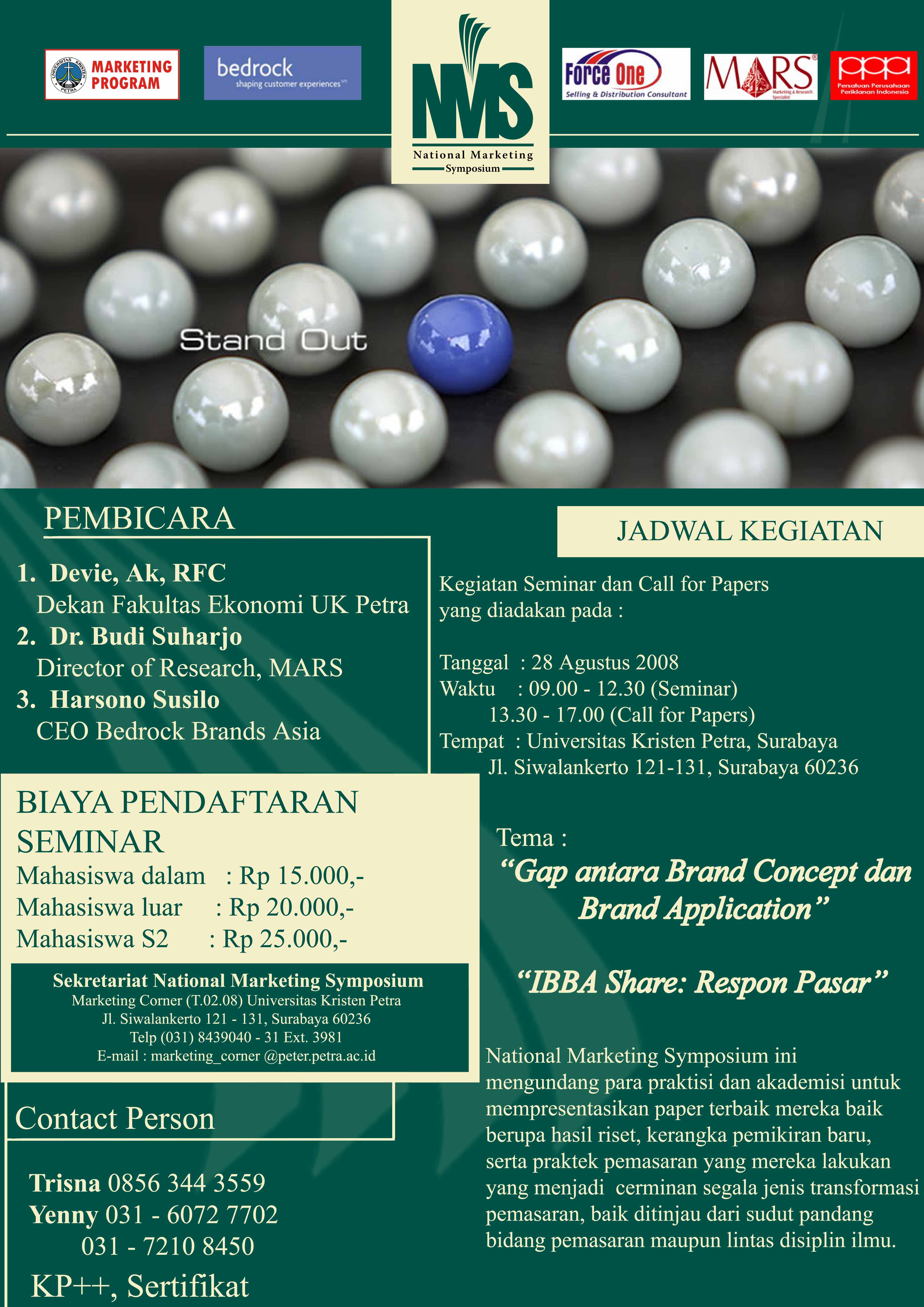 Poster ini berisi informasi kegiatan seminar dan call for papers yang diadakan pada tanggal 28 Agustus 2008 di UK Petra dengan tema "Gap antara brand concept dan brand application" dan "IBBA share: respon pasar". Penyelenggara adalah Jurusan Manajemen Pemasaran FE UK Petra. Symposium ini mengundang para praktisi dan akademisi untuk mempresentasikan paper terbaik mereka baik berupa hasil riset, kerangka pemikiran baru, serta praktek pemasaran yang mereka lakukan yang menjadi cerminan segala jenis transformasi pemasaran, baik ditinjau dari sudut pandang bidang pemasaran maupun lintas disiplin ilmu. Poster ini didesain dengan konsep simple dan formal. Dalam poster tampak logo NMS dan di atas huruf M ada gambar simbolik yakni lembaran-lembaran buku yang identik dengan pengetahuan sesuai dengan tujuan simposium yakni memajukan pengetahuan. Warna poster dipilih warna tenang yaitu hijau, bisa diartikan juga dewasa, atau matang di bidangnya. Gambar bola-bola yang berjejer berwarna silver, namun di tengahnya ada 1 bola berwarna biru mengandung makna "berbeda dengan yang lain" artinya peserta diharapkan dapat menciptakan pengetahuan yang lain daripada yang lain di bidang marketing.