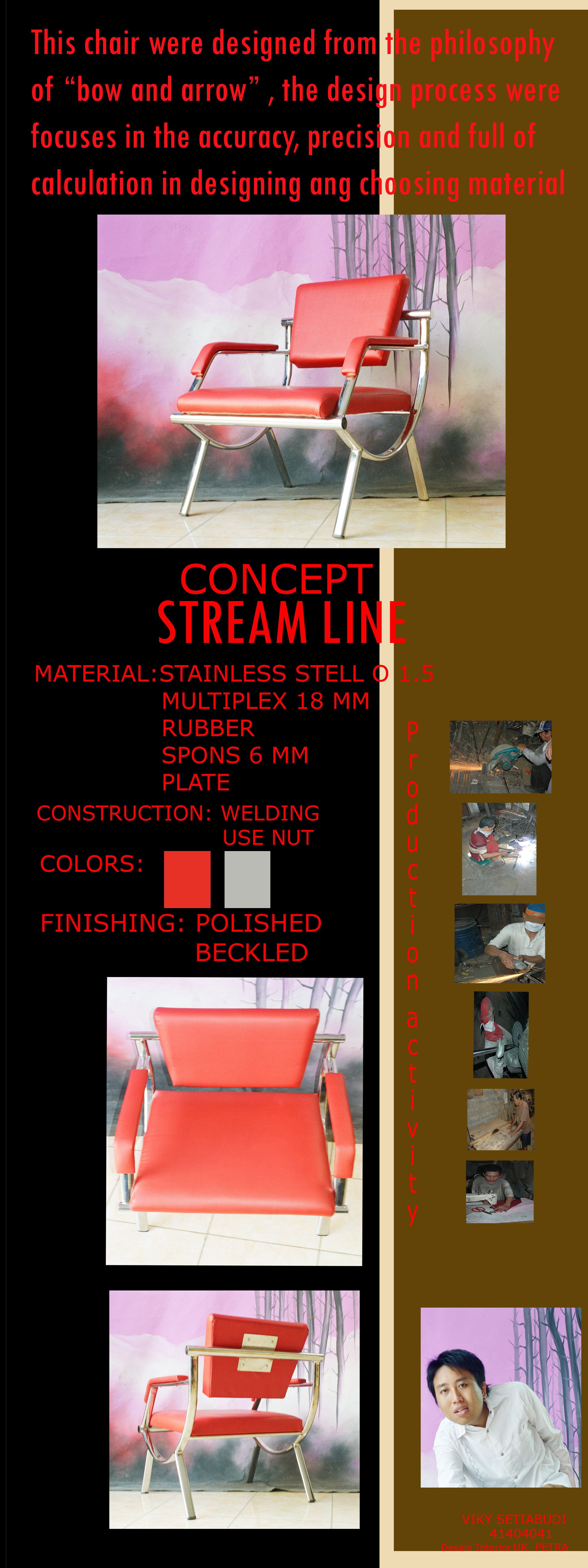 This chair was designed from the philosophy of "bow" and arrow", the design process were focused in the accuracy, precision and full of calculation in designing and choosing material. This chair was designed with the streamline concept.