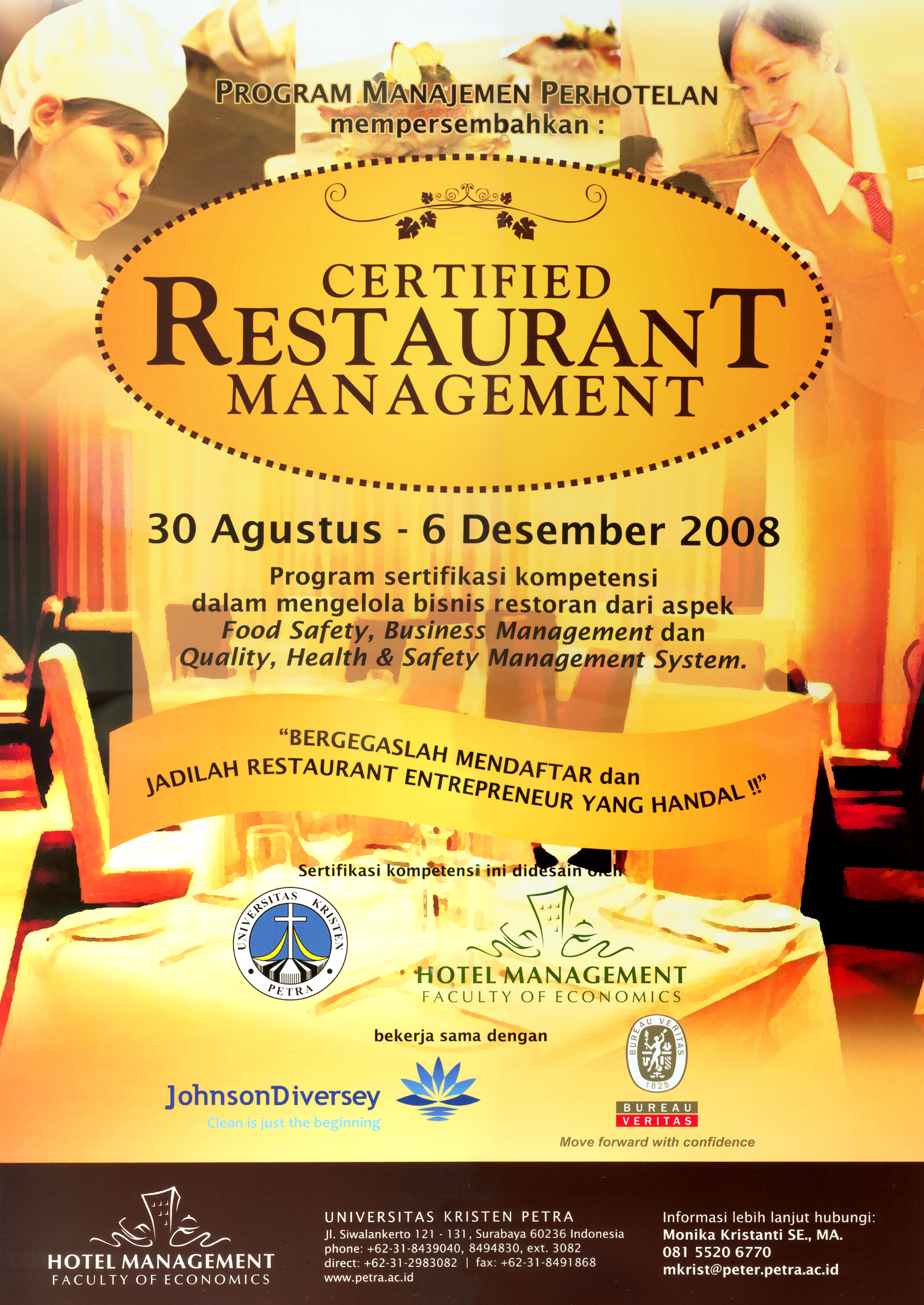 Program Manajemen Perhotelan mempersembahkan "Certified Restauant Management" yaitu program sertifikasi kompetensi dalam mengelola bisnis restoran dari aspek food safety, business management and quality, health and safety management system. Kegiatan ini akan berlangsung dari tanggal 30 Agustus - 6 Desember 2008.