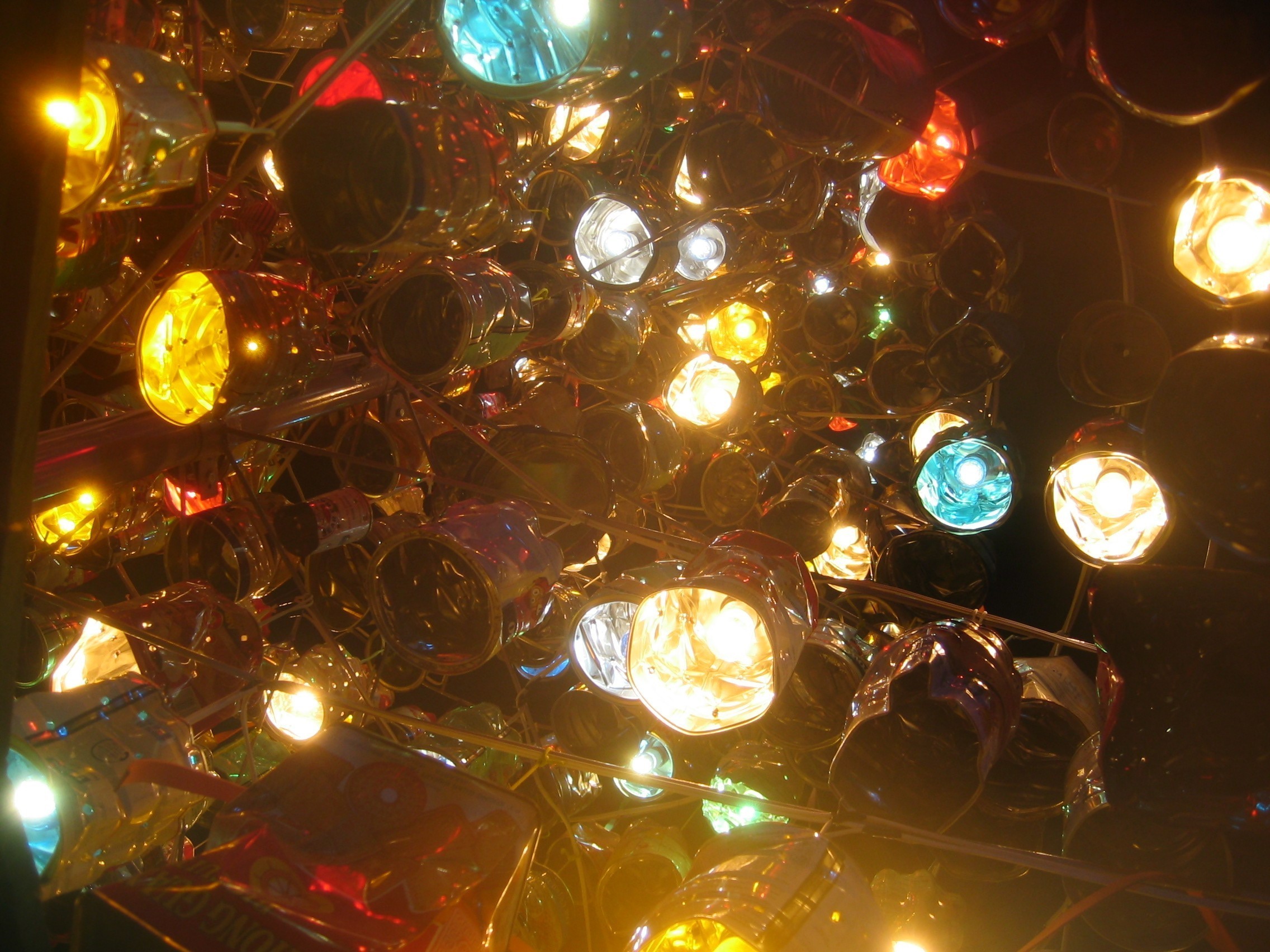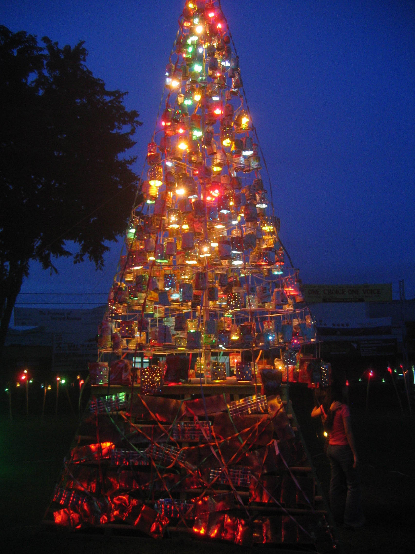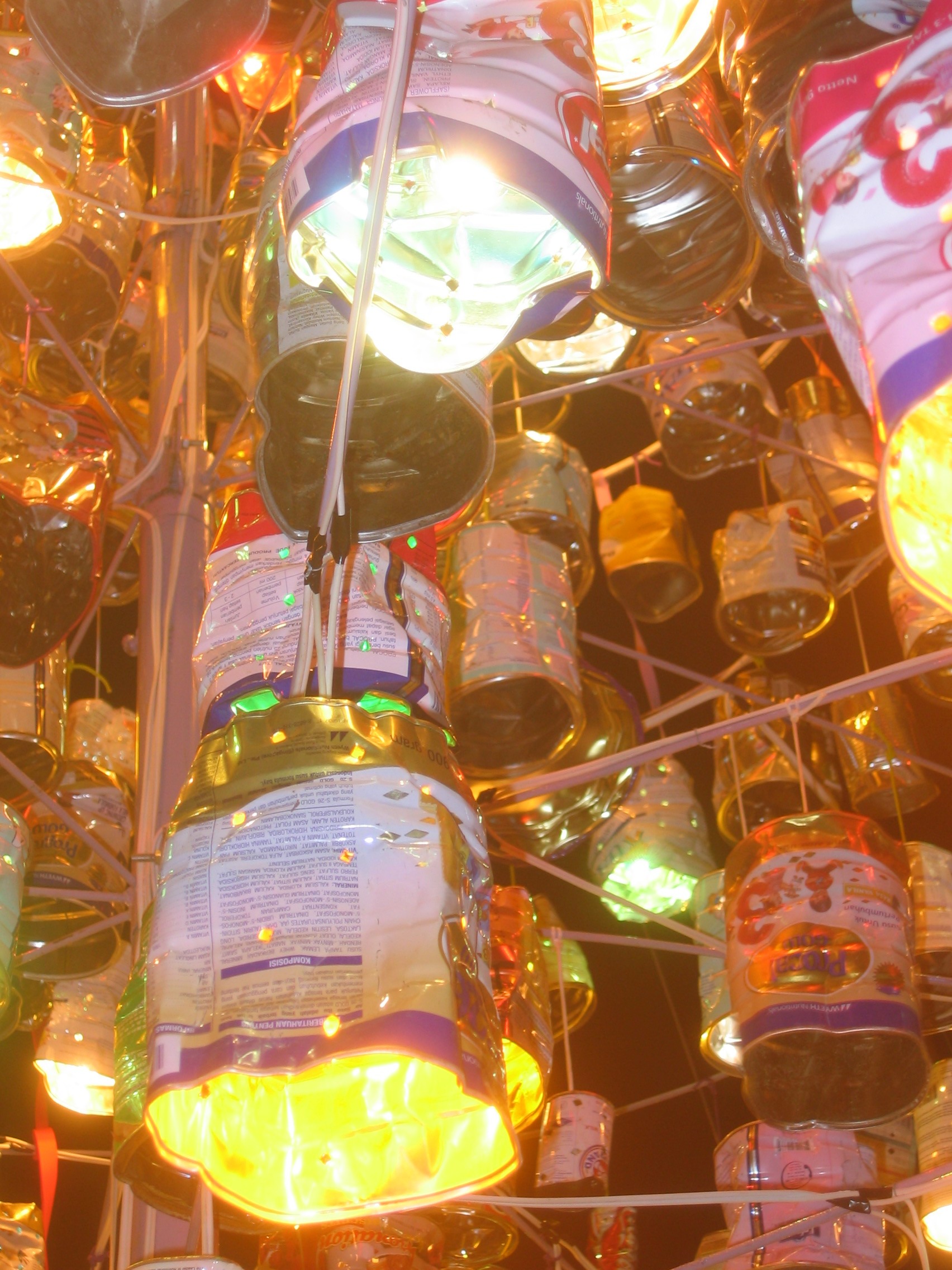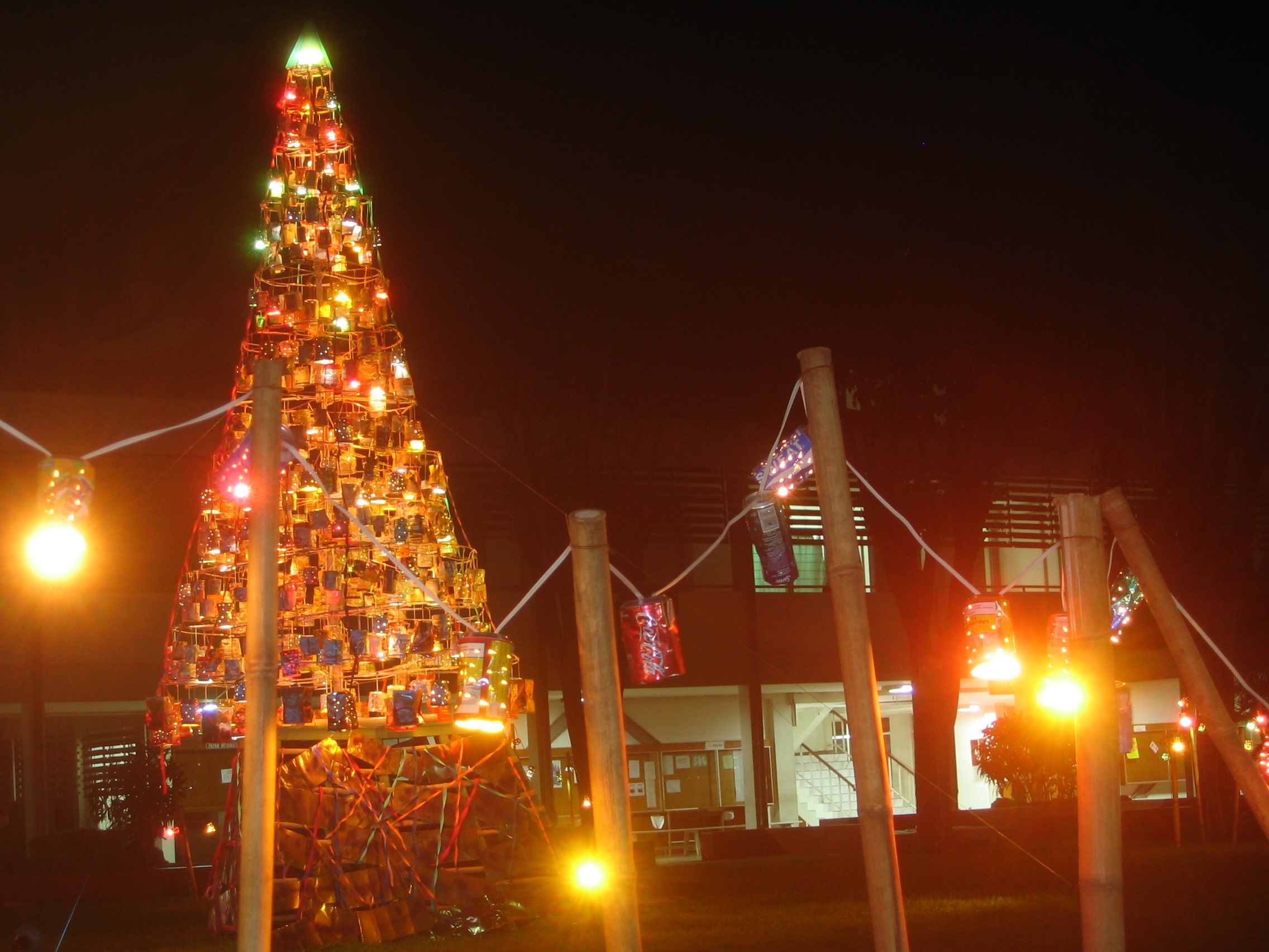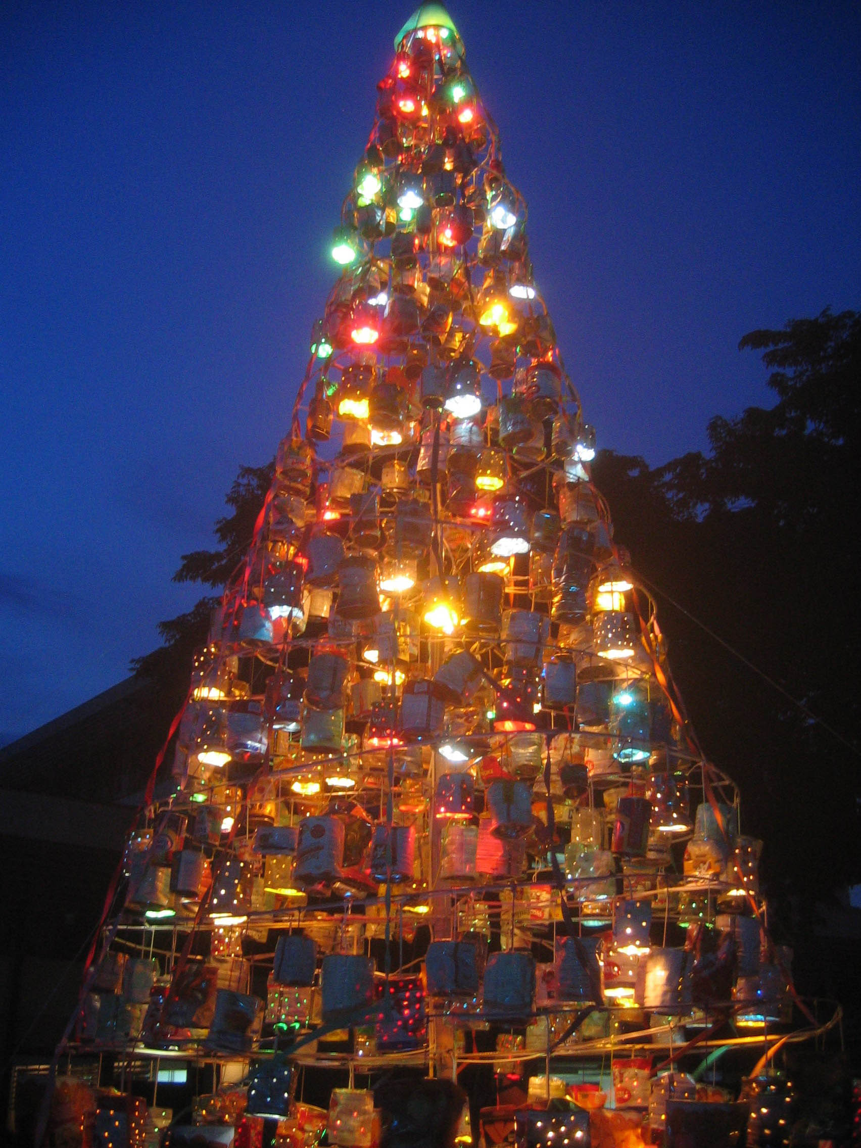 This Christmas Tree, called "Christmas Tree of Togetherness", is maked of 860 used tin cans, and reaches 5.60 m. The use tin cans were collected by the Petra Christian University staff.