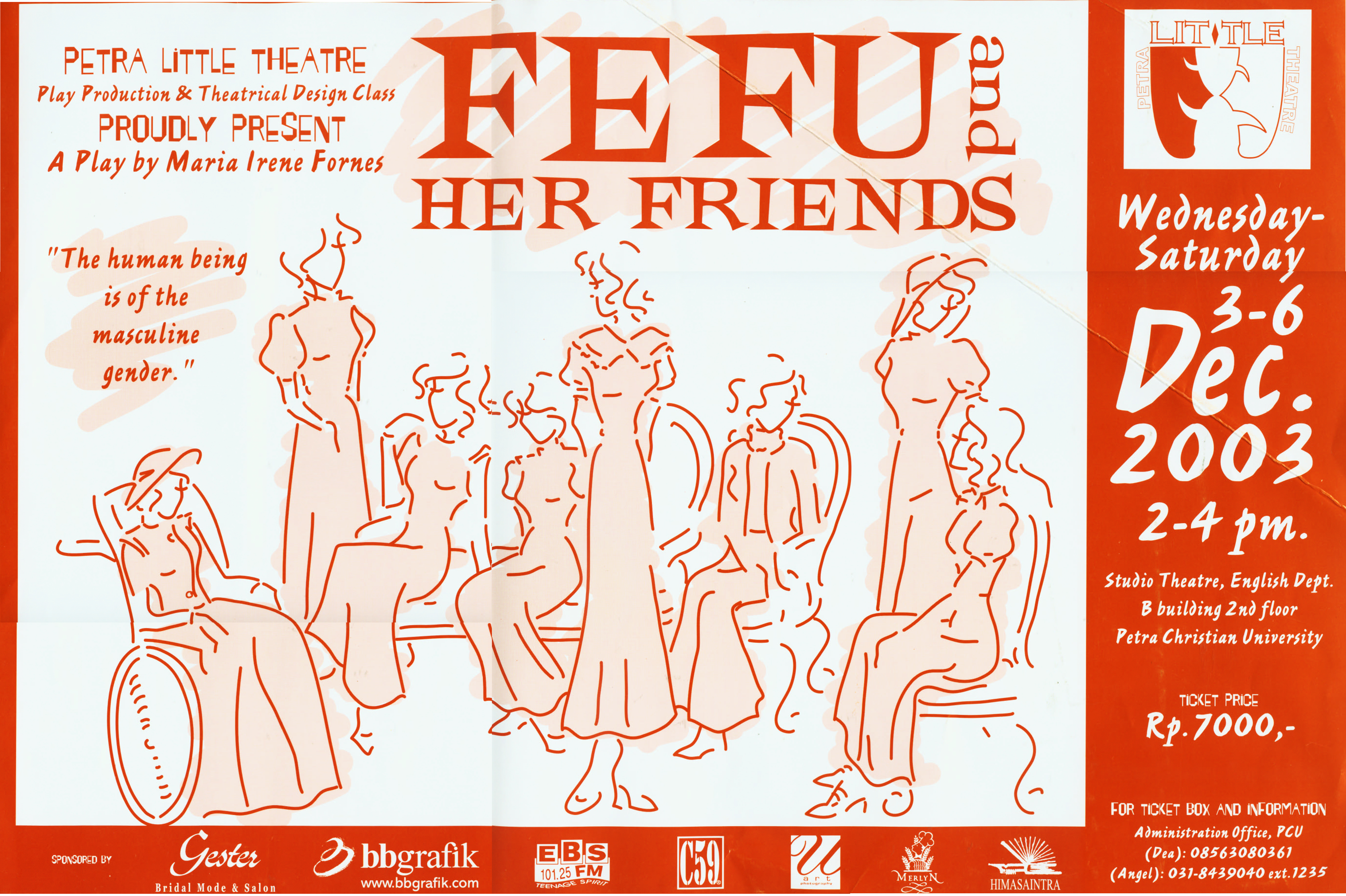Poster kegiatan yang diadakan oleh Petra Little Theatre di Gedung B lantai 2 Jurusan Sastra Inggris Fakultas Sastra Universitas Kristen Petra pada tanggal 3-6 Desember 2003