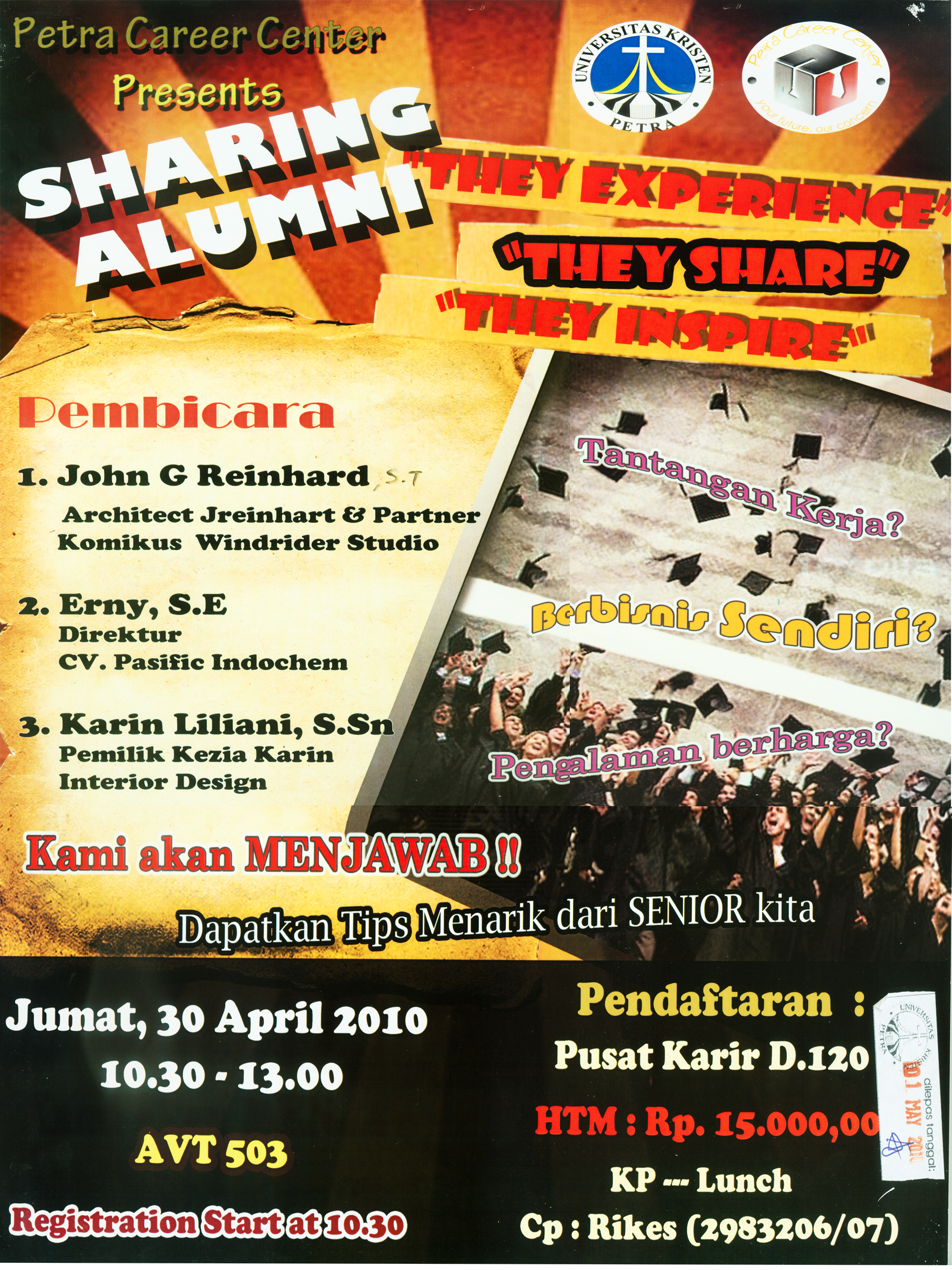 Petra Career Center atau Pusat Karir Universitas Kristen Petra mengadakan acara Sharing Alumni dengan pembiacara John G Reinhart, Erny S.E dan Karin Liliani S.Sn pada tanggal 30 April 2010.