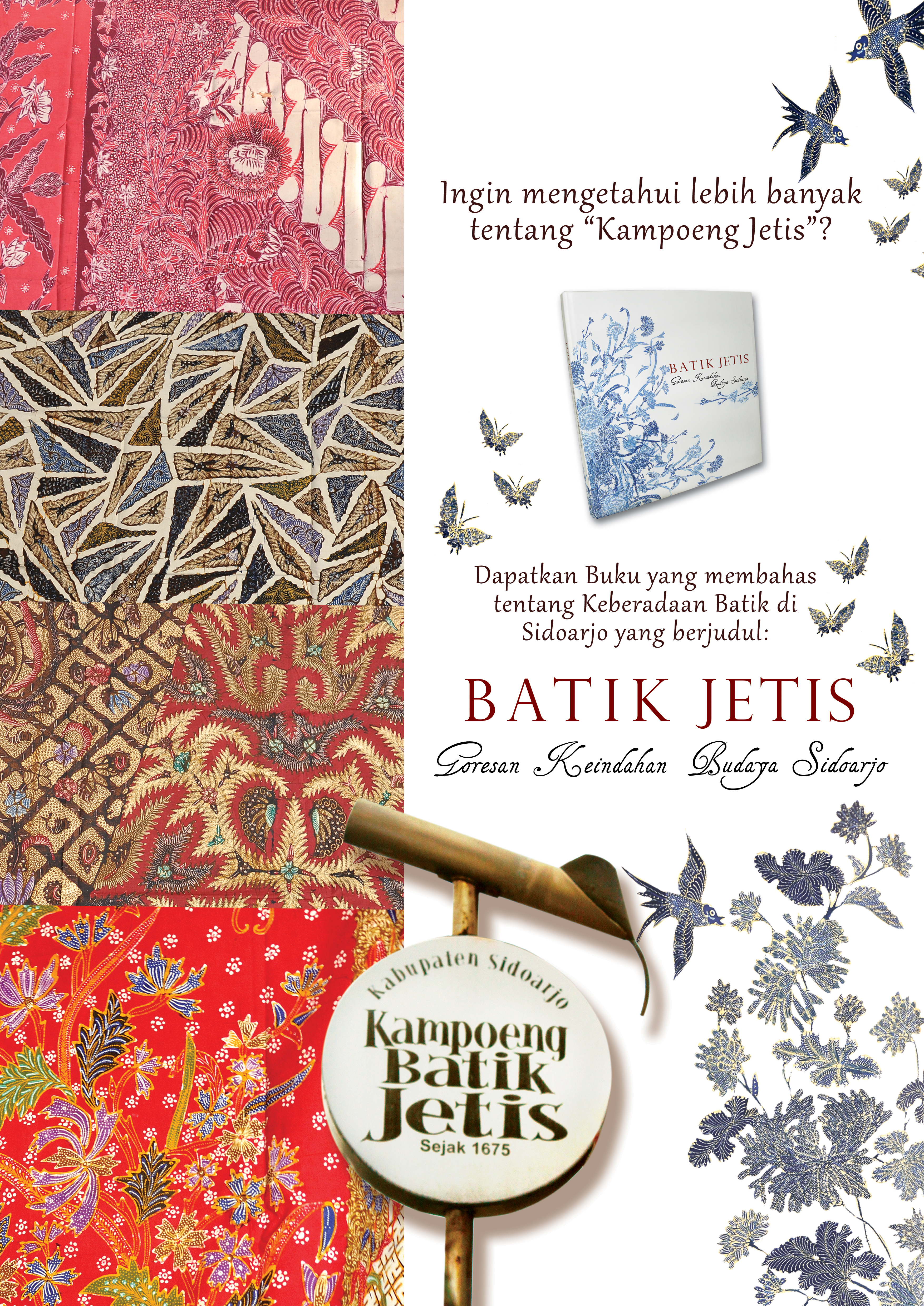 Sidoarjo adalah salah satu daerah perbatikan kuno Jawa Timur yang sudah berkembang sejak sangat lama yang menurut catatan setempat batik sudah dikenal sejak abad Sembilan belas. Namun sangat ironis kalau batik Sidoarjo yang awalnya memiliki karakter dan kualitas yang baik, tidak dikenal oleh masyarakat umum diluar Sidoarjo, bahkan sampai saat ini batik Sidoarjo yang dikenal sebagai batik Madura. Masyarakat secara umum menyebut batik Sidoarjo sebagai batik Madura. . Maka dari itu dibuat suatu perancangan Buku, untuk dapat memberikan informasi kepada masyarakat luas mengenai Batik Sidoarjo (Jetis) sebagai batik yang sudah lama ada di Indonesia.
