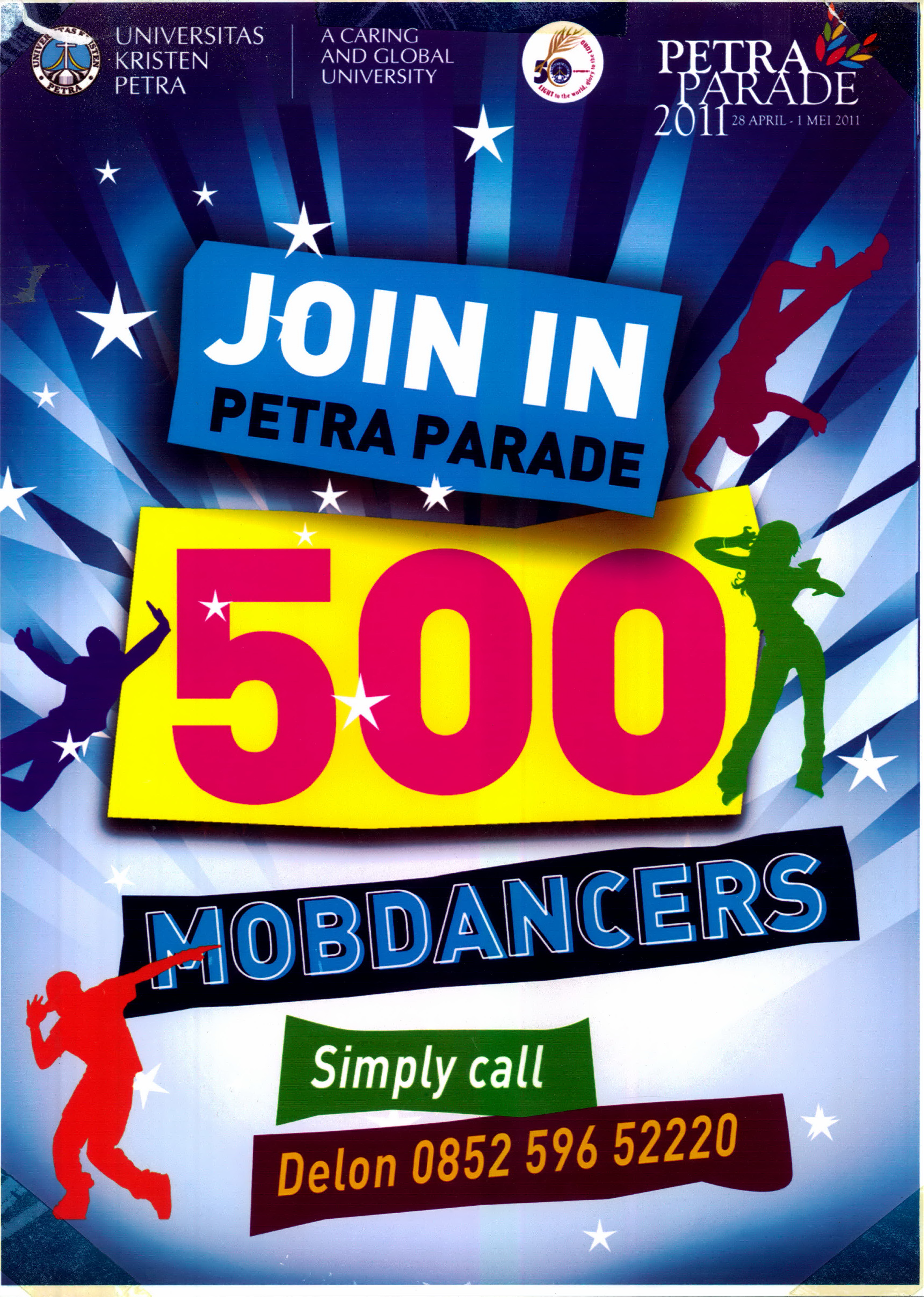 Petra Parade mengundang mahasiswa untuk turut berpartisipasi dalam Petra Parade 2011 dengan bergabung dalam 500 MOB Dancer. Petra Parade 2011 diadakan mulai tanggal 28 April hingga 1 Mei 2011. Bagi mahasiswa yang berminat dapat menghubungi contact person yang tercantum di poster tersebut.