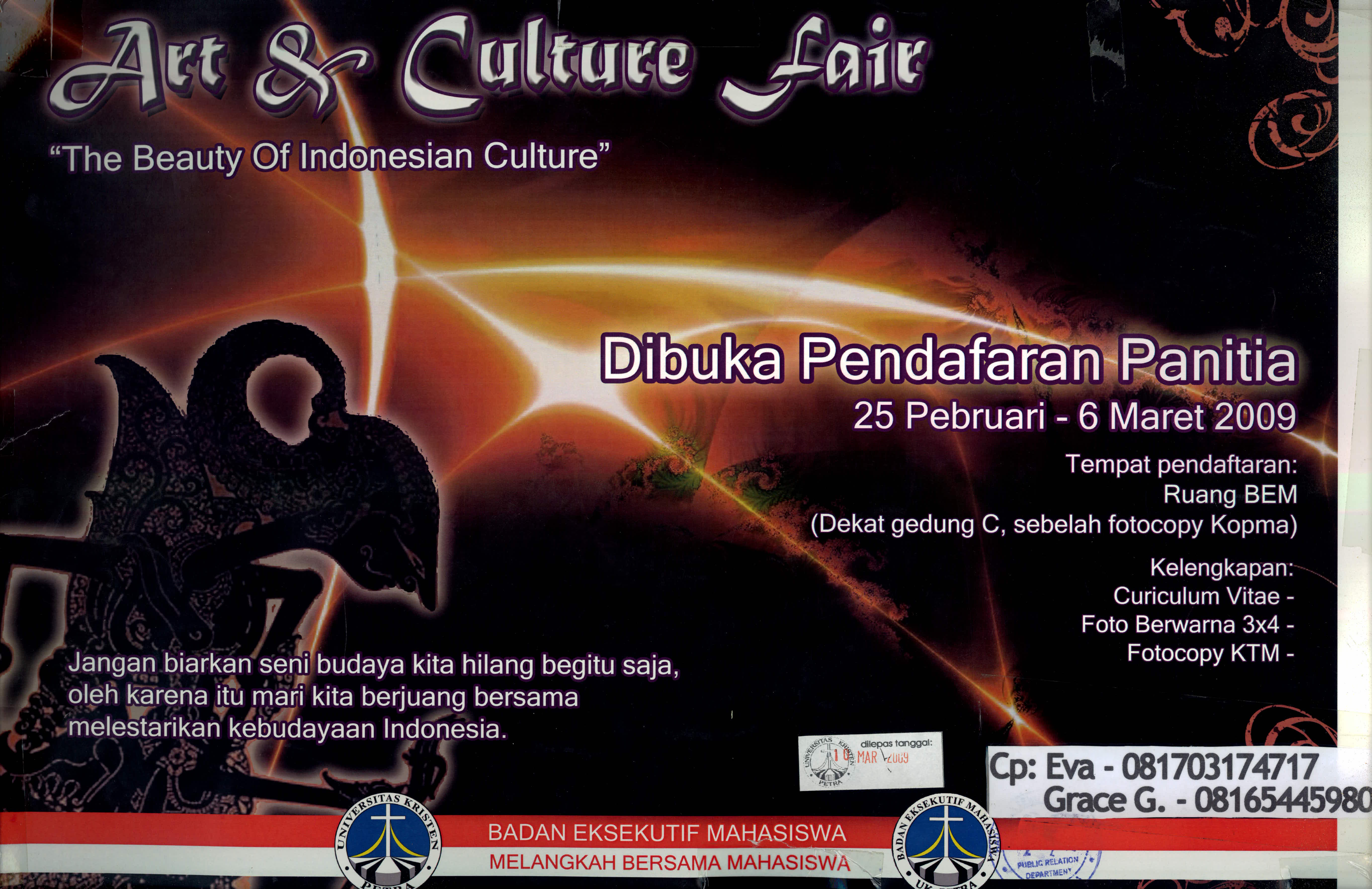 At & Culture Fair membuka pendaftaran bagi mahasiswa yang bemrinat untuk menjadi panitia. Pendaftaran ini dilakukan tanggal 25 Februari-6 Maret 2009 dengan membawa kelengkapan yang tertera. Art & Culture Fair kali ini mengangkat tema "The Beauty of Indonesian Culture".