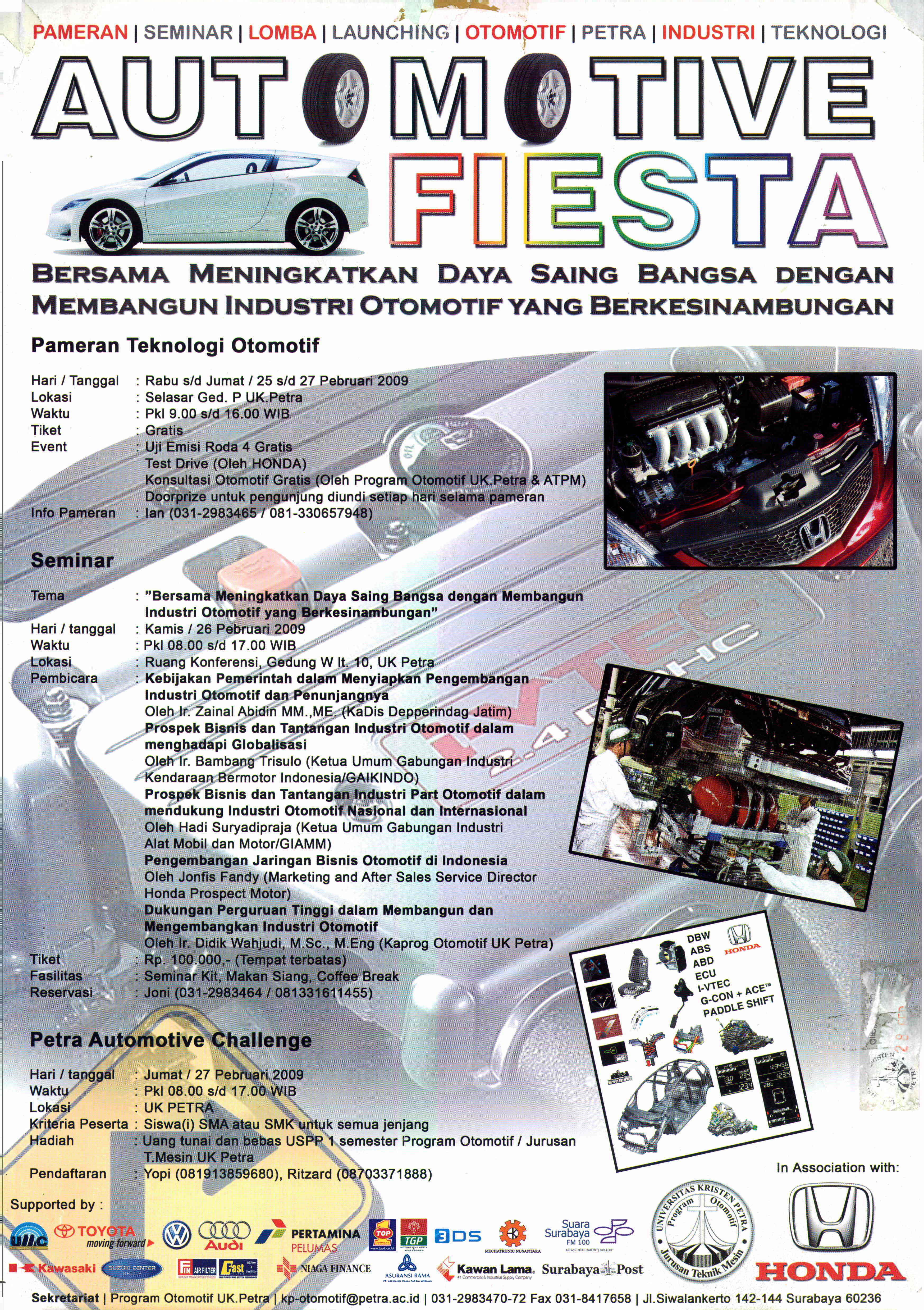 AUTOMOTIVE FIESTA diadakakan dengan menghadirkan serangkaian acara. Diantaranya yaitu Seminar (28 Februari 2009), Pameran Teknologi Otomotif (25-27 Februari 2009) di selasar gedung P UK Petra disertai dengan uji emisi roda 4 gratis, test drive Honda, konsultasi otomotif gratis, Petra Automotive Challenge (27 Februari 2009) yang merupakan lomba untuk siswa-siswi SMA.
