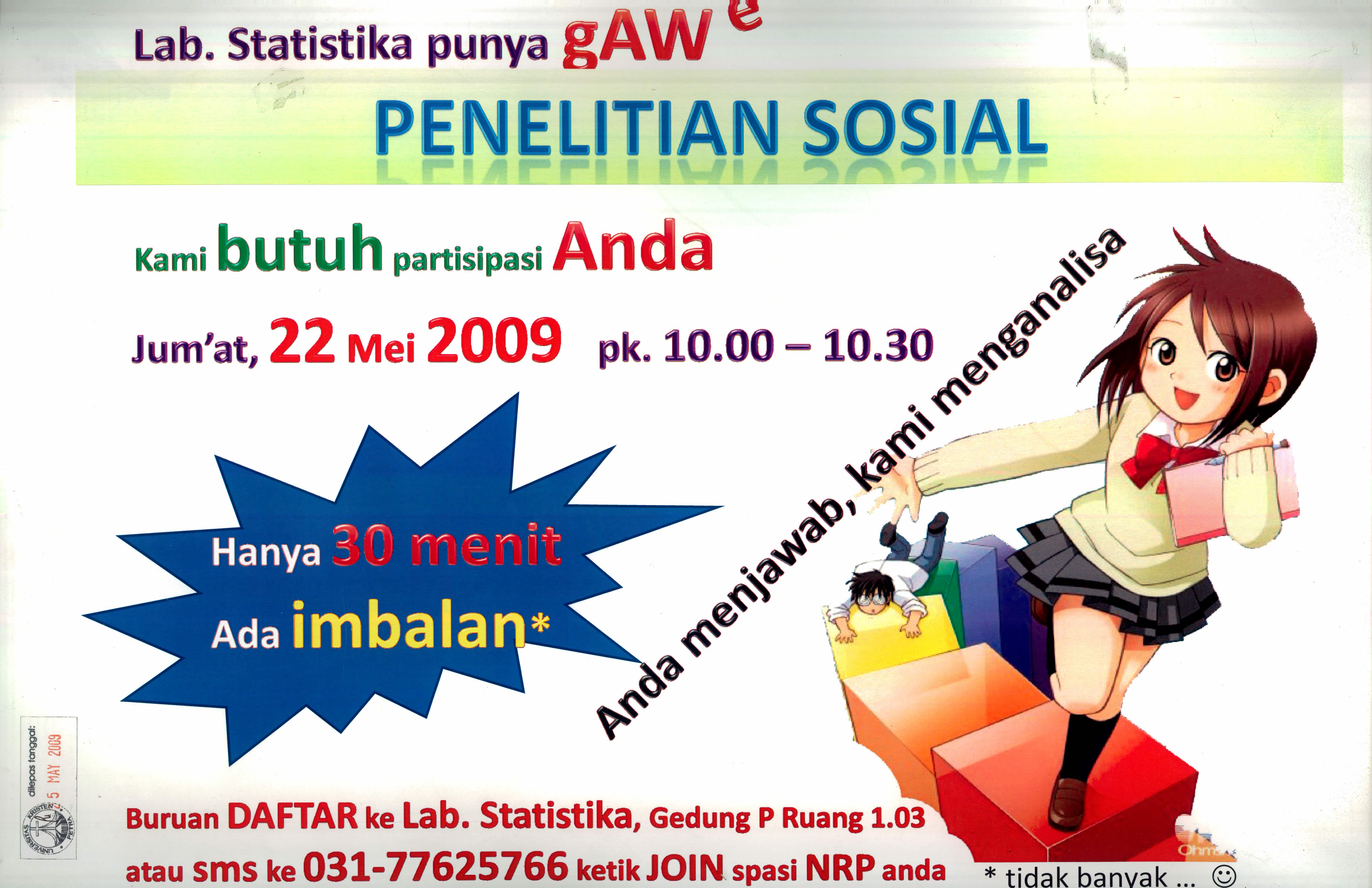 Laboratorium Statistika memiliki gawe, yaitu Penelitian Sosial. Bagi yang berminat dapat datang ke lab Stat di Gedung P pada 22 Mei 2009 , hanya 30 menit saja. Ada imbalan bagi yang datang dan menjawab. Jawaban akan dianalisa sehubungan dengan penelitian sosial yang dilakukan.
