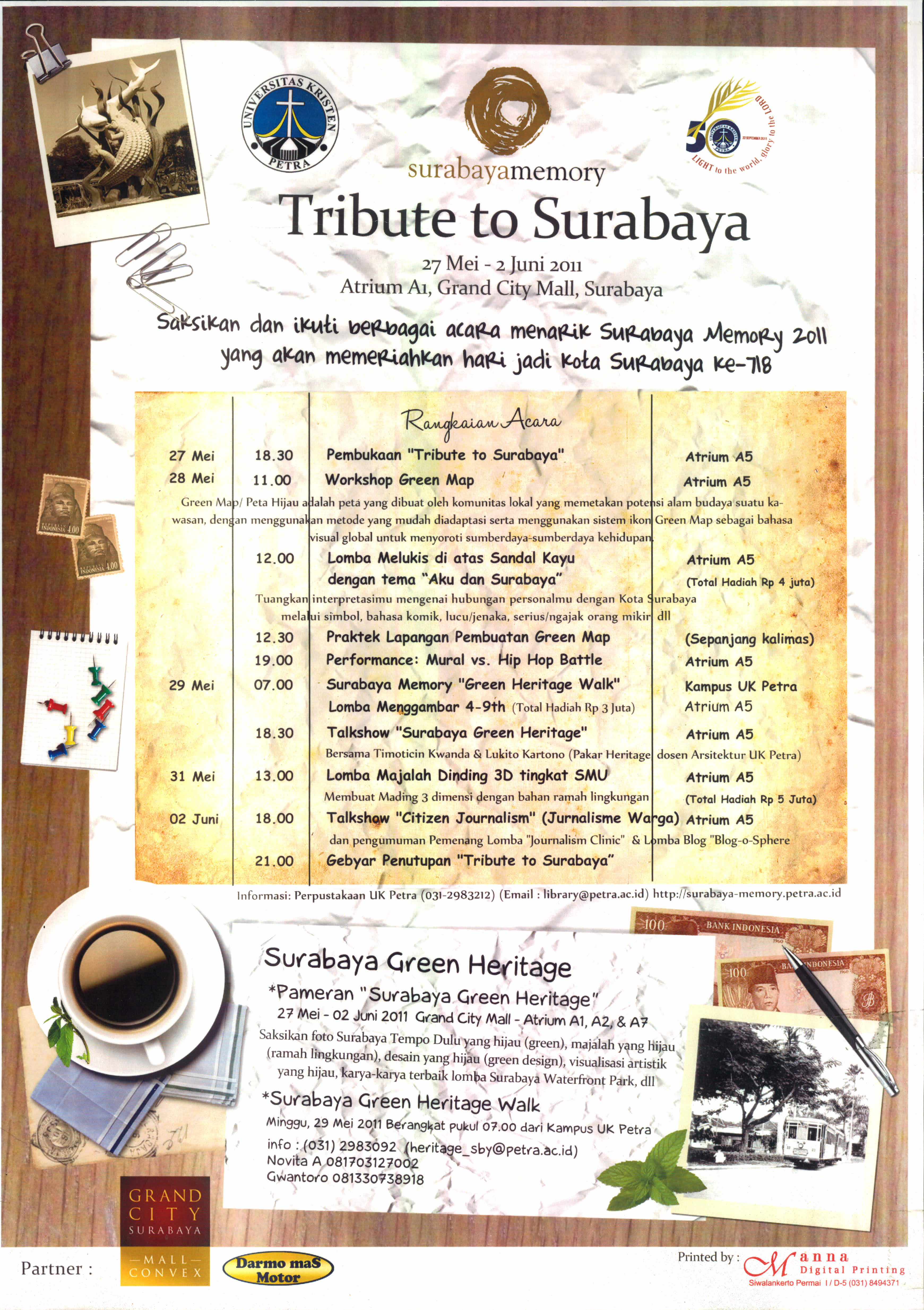 Acara Tribute to Surabay diselenggarakan tanggal 27 Mei hingga 2 Juni 2011 dengan serangkaian acara yan digelar di Atrium Grand City Mall, Surabaya. Ada pula pameran berjudul "Surabaya Green Heritage". Selain itu pula ada juga acara Surabaya Green Heritage Walk.