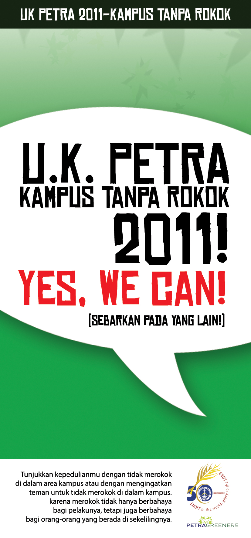 UK Petra 2011 kampus tanpa rokok YES WE CAN! Tunjukkan kepedulian dengan tidak merokok di dalam area kampus atau mengingatkan teman untuk tidak merokok di dalam area kampus. Merokok tidak hanya berbahaya bagi pelakunya, tapi juga berbahaya bagi orang-orang di sekelilingnya.
