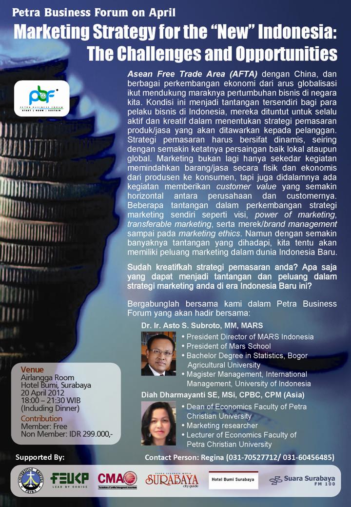 Petra Bussiness Forum on April, Marketing Strategy for The "New" Indonesia: The Challenges and Opportunities hadir bersama Dr. Ir. Asto S. Subroto, MM, MARS dan Diah Dharmayanti SE, Msi, CPBC, CPM (Asia) tanggal 20 April 2012 bertempat di Airlangga Room Hotel Bumi Surabaya . Asean Free Trade Arean (AFTA) dengan China dan berbagai perkembangan ekonomi dari arus globalisasi ikut mendukung maraknya pertumbuhan bisnis di Indonesia. Apa saja yang dapat menjadi tantangan dan peluang dalam strategi marketing anda di Era Indonesia yang baru ini? Temukan jawabannya dalam Petra Business Forum ini