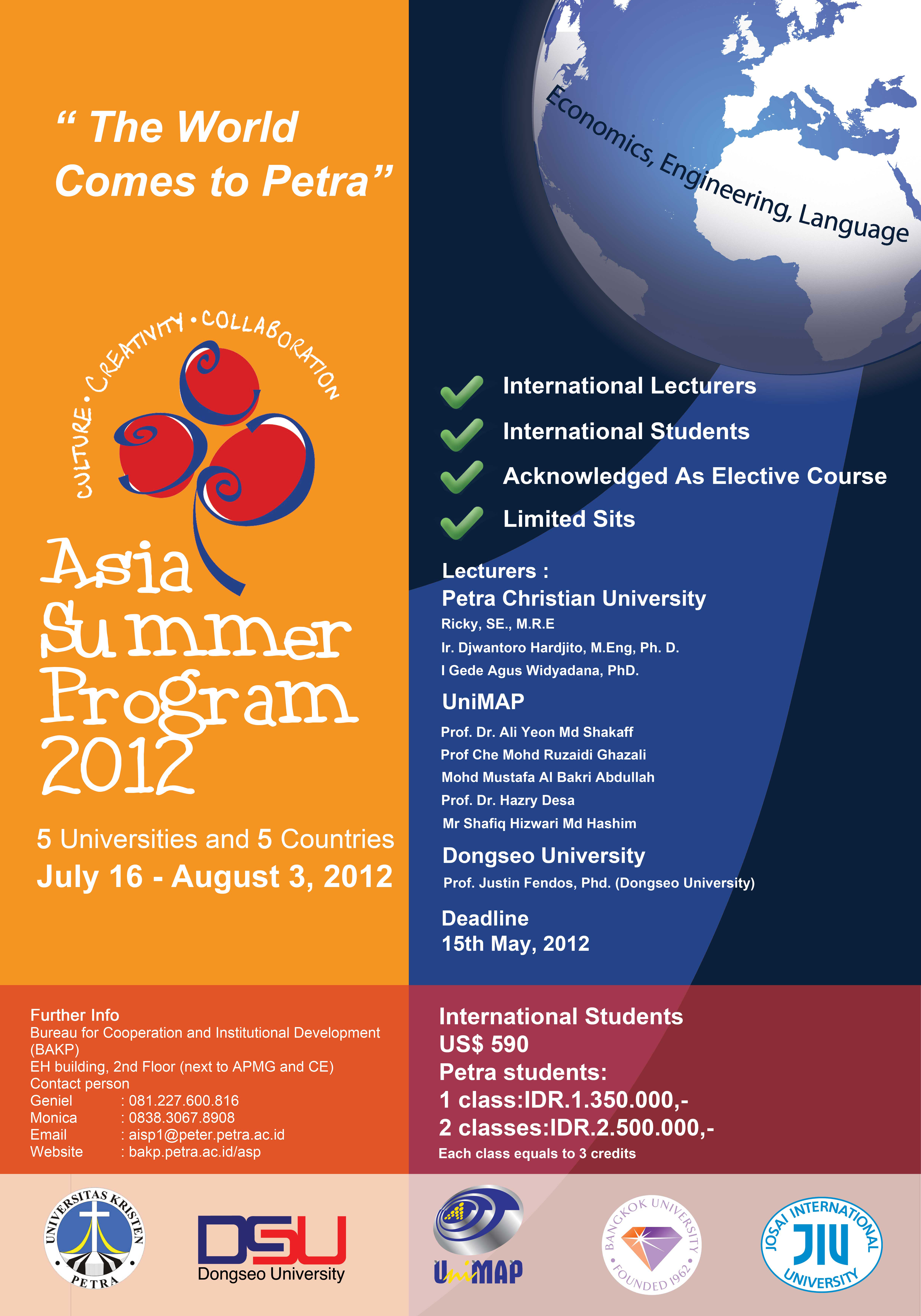 Asia Summer Program akan diselenggarakan 16 Juli hingga 3 Agustus 2012 dengan diikuti 5 universitas dari 5 negara. Acara ini merupakan kerjasama dari Universitas Kristen Petra, Bangkok Univeristy, UniMAP, Dongseo University, dan Josai International University.