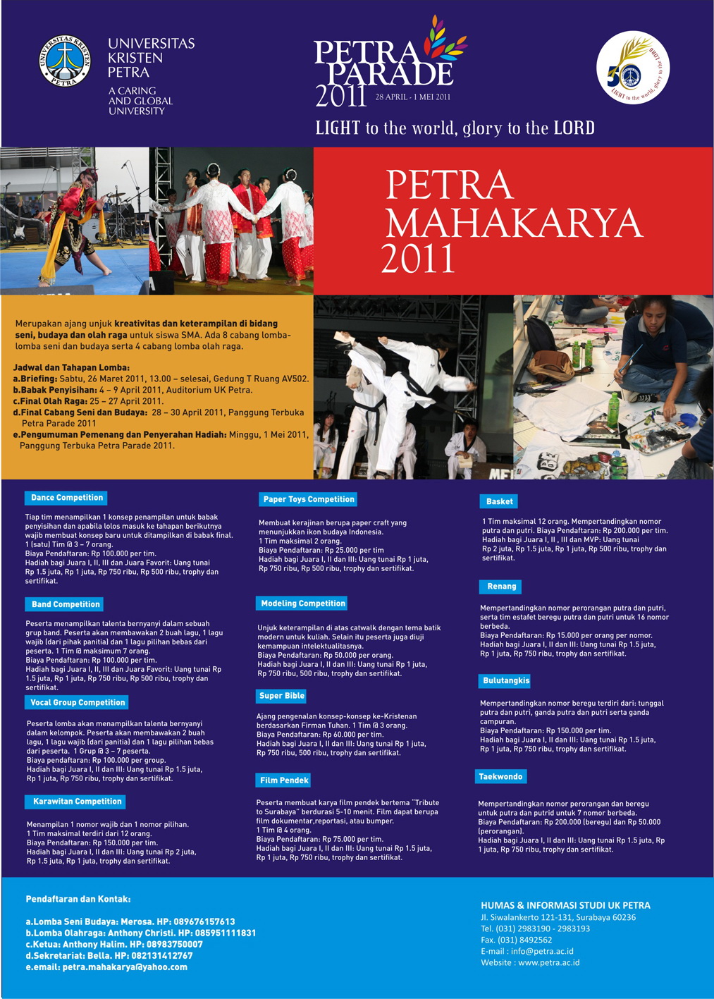 Dalam rangka Petra Parade 2011, UK Petra mengusung sebuah acara Petra Mahakarya 2011. Petra Mahakarya 2011 merupakan ajang untuk kreativitas dan ketrampilan di bidang seni, budaya, dan olahraga untuk siswa SMA. Ada 8 cabang lomba-lomba seni dan budaya serta 4 cabang olahraga, diantaranya adalah dance competition, band competition, vocal group competition, karawitan competition, paper toys competition, modeling competition, super bible, film pendek, basket, renang, taekwondo, bulutangkis.