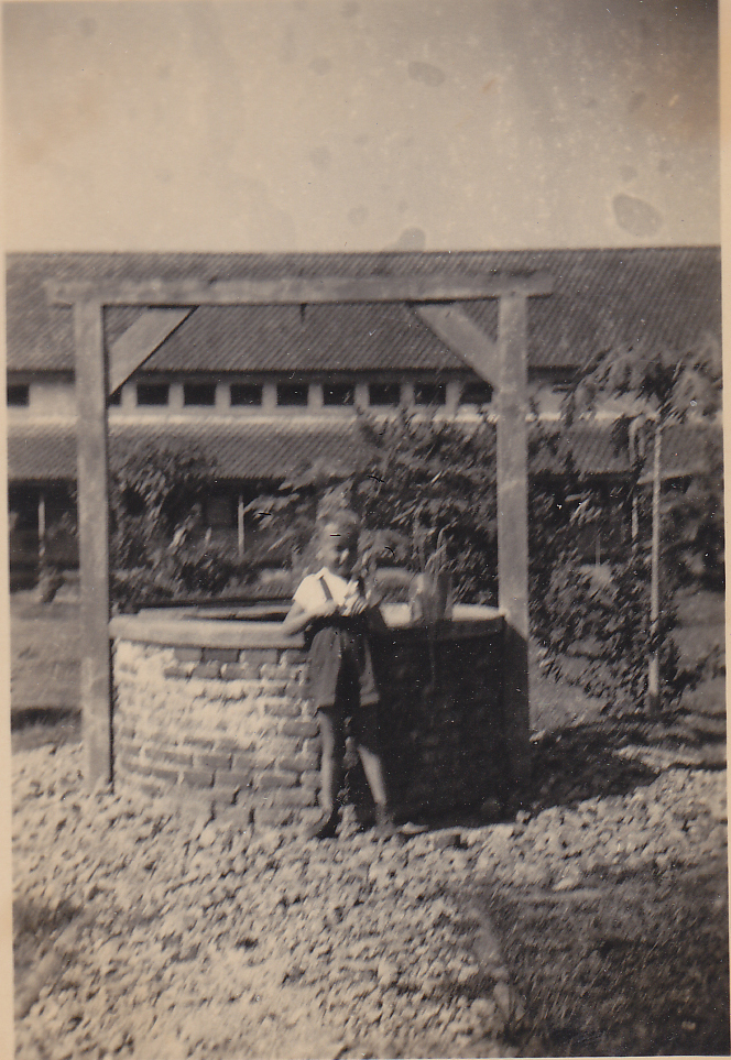 Seorang anak panti keturunan Belanda berdiri di muka sumur tua yang ada di halaman panti asuhan tahun 1950.