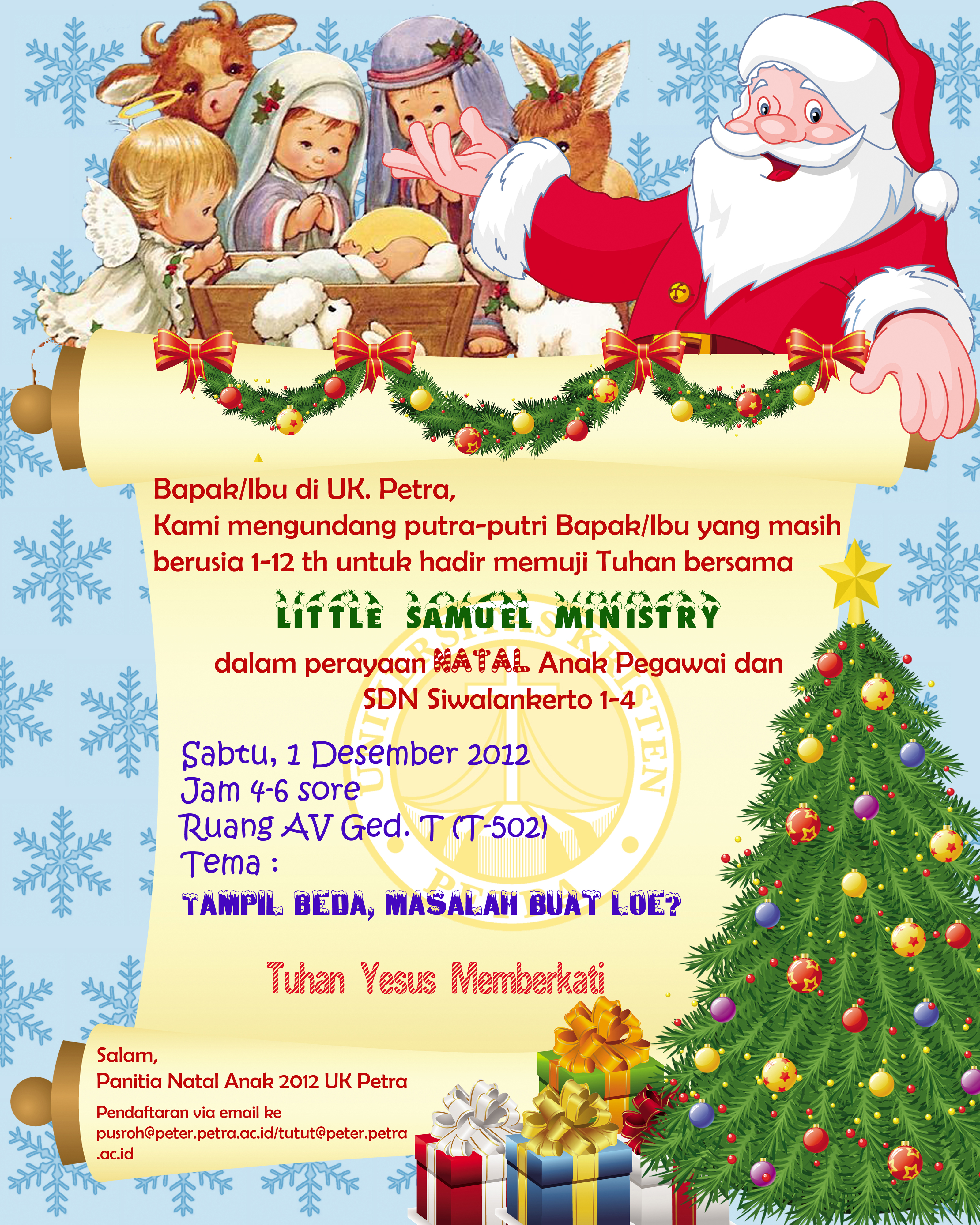 Poster ini berisi ajakan bagi para Bapak/ibu di UK Petra yang putra-putrinya masih berumur 1-12tahun untuk hadir memuji Tuhan bersama "Little Samuel Ministry", dalam perayaan Natal anak pegawai dan SDN Siwalankerto 1-4 pada tanggal 1 Desember 2012 bertempat di gedung T, AVT lantai 5 (T 502), dengan tema "Tampil Beda, Masalah Buat Loe?"