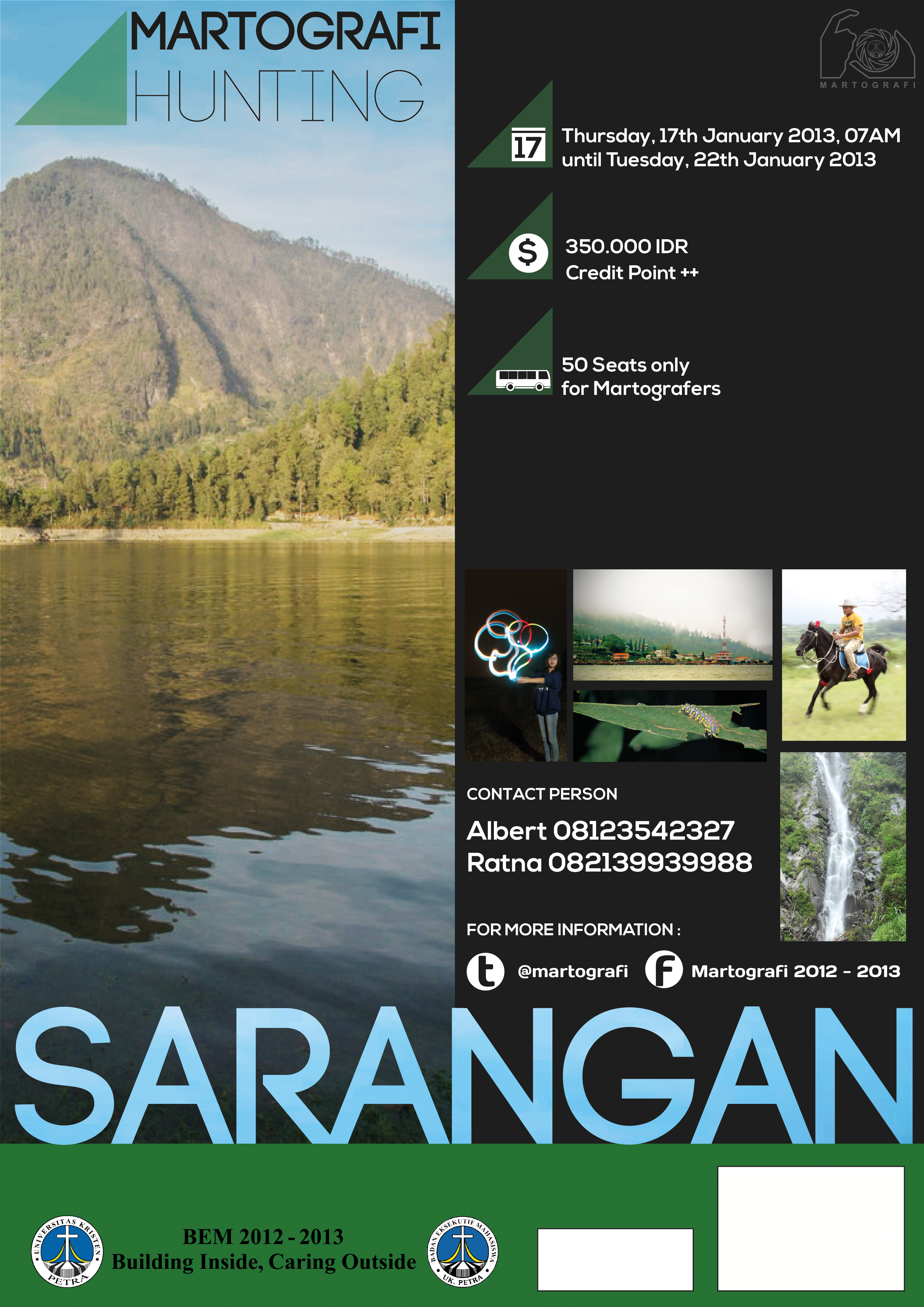 UKM Martografi mengadakan hunting ke Sarangan pada tanggal 17 Januari hingga 22 Januari 2013. Biaya pendaftaran sebesar Rp 350.000, dan hanya terbatas untuk 50 orang saja.