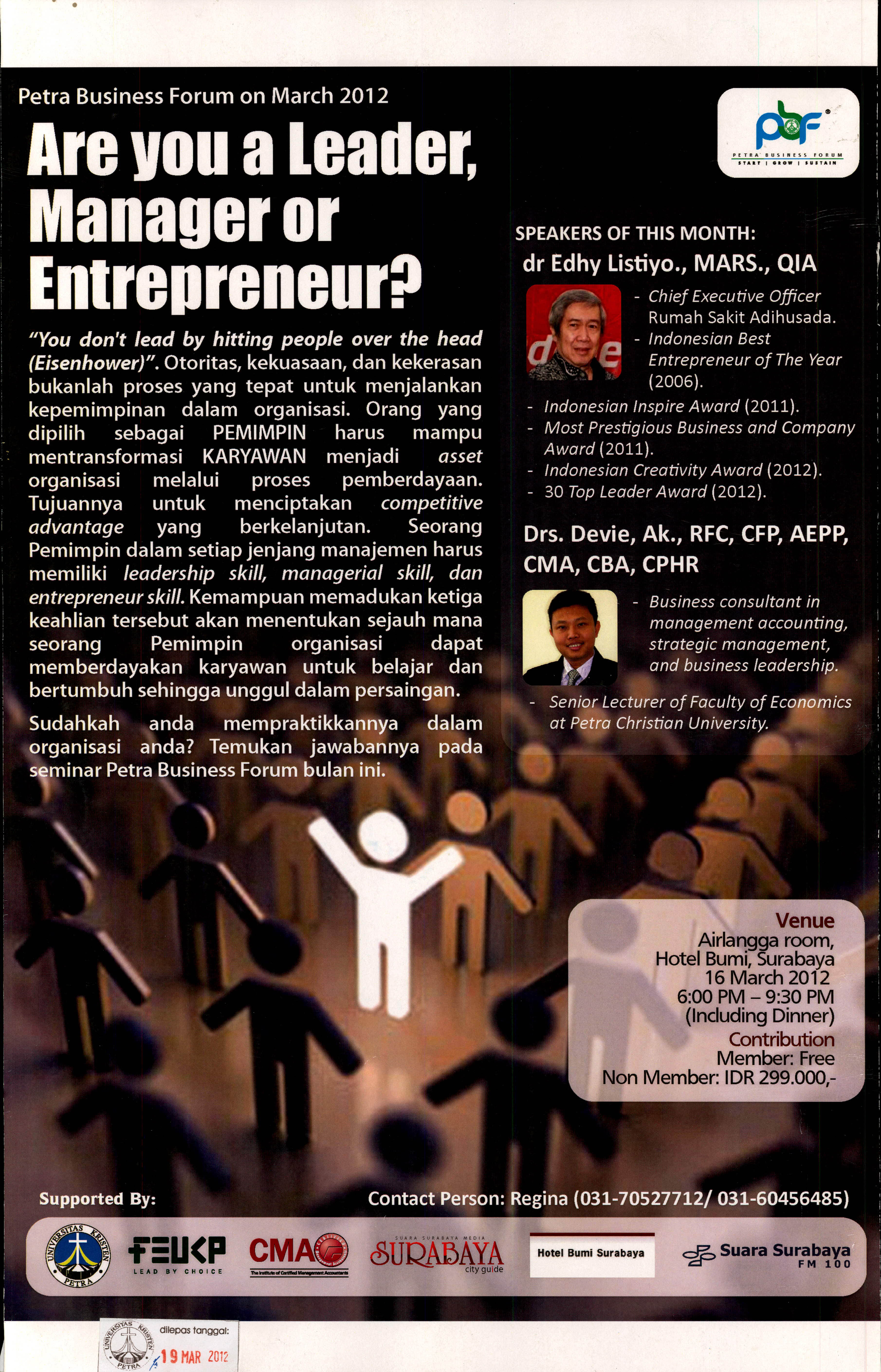 Petra Business Forum Maret 2012 dengan tema "Are You a Leader, Manager, or Enrepreneur?" dengan pembicara dr.Edhy Listiyo., MARS., QIA. dan Drs. Devie Ak.