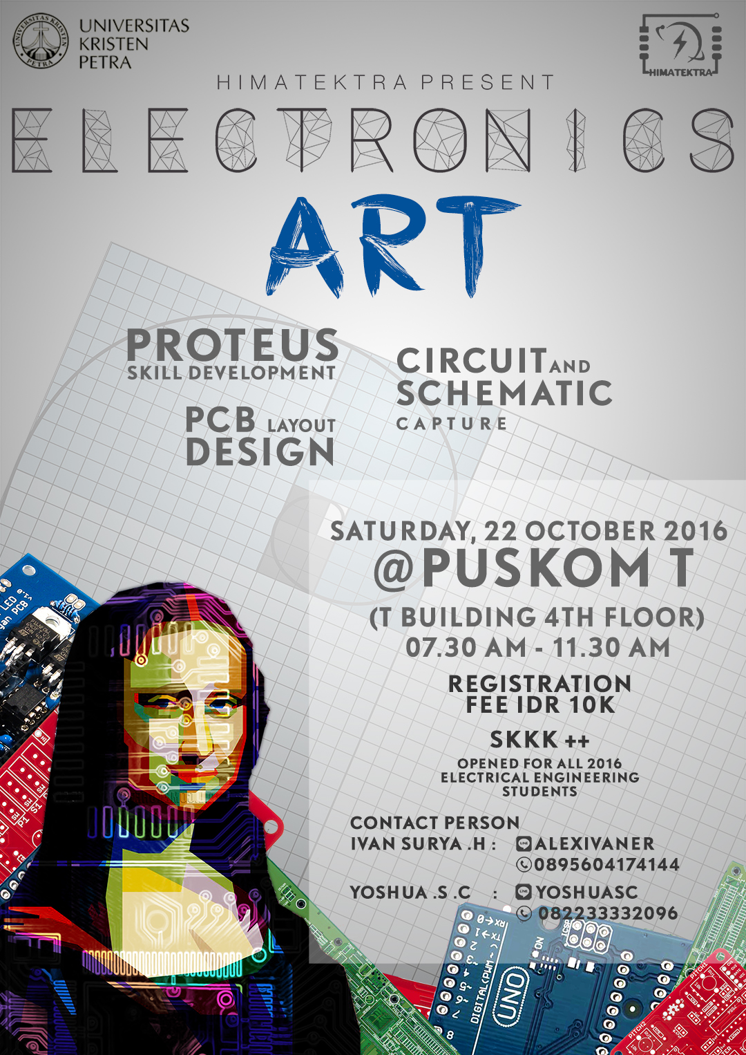 Hima Teknik Elektro UK Petra mengadakan pelatihan dengan tema "Electronics Art". Kegiatan ini dilaksanakan pada 22 Oktober 2016 bertempat di Puskom T. lantai 4 gedung T.