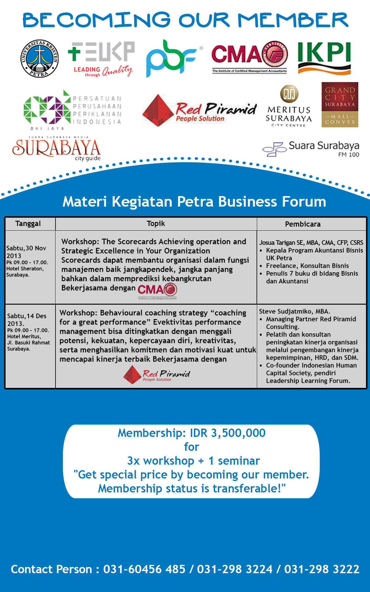 Fakultas ekonomi UK. Petra mengadakan sebuah acara dengan tema "Becoming Our Member". Acara ini dikenakan biaya sebesar Rp. 3.500.000,00 bagi yang telah menjadi member untuk mengikuti Petra Bussiness Forum sebanyak 3 kali workshop dan 1 kali seminar dengan pembicara yang telah berpengalaman di bidangnya.