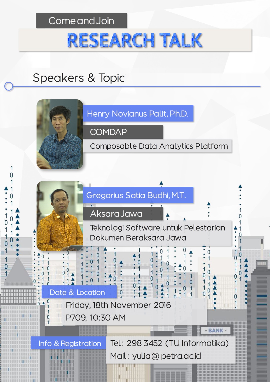 Program studi Informatika UK Petra mengadakan acara research talk dengan menghadirkan Henry Novianus Palit dan Gregorius Satia Budhi sebagai narasumber. Acara ini dilaksanakan pada 18 November 2016 di gedung P.709.