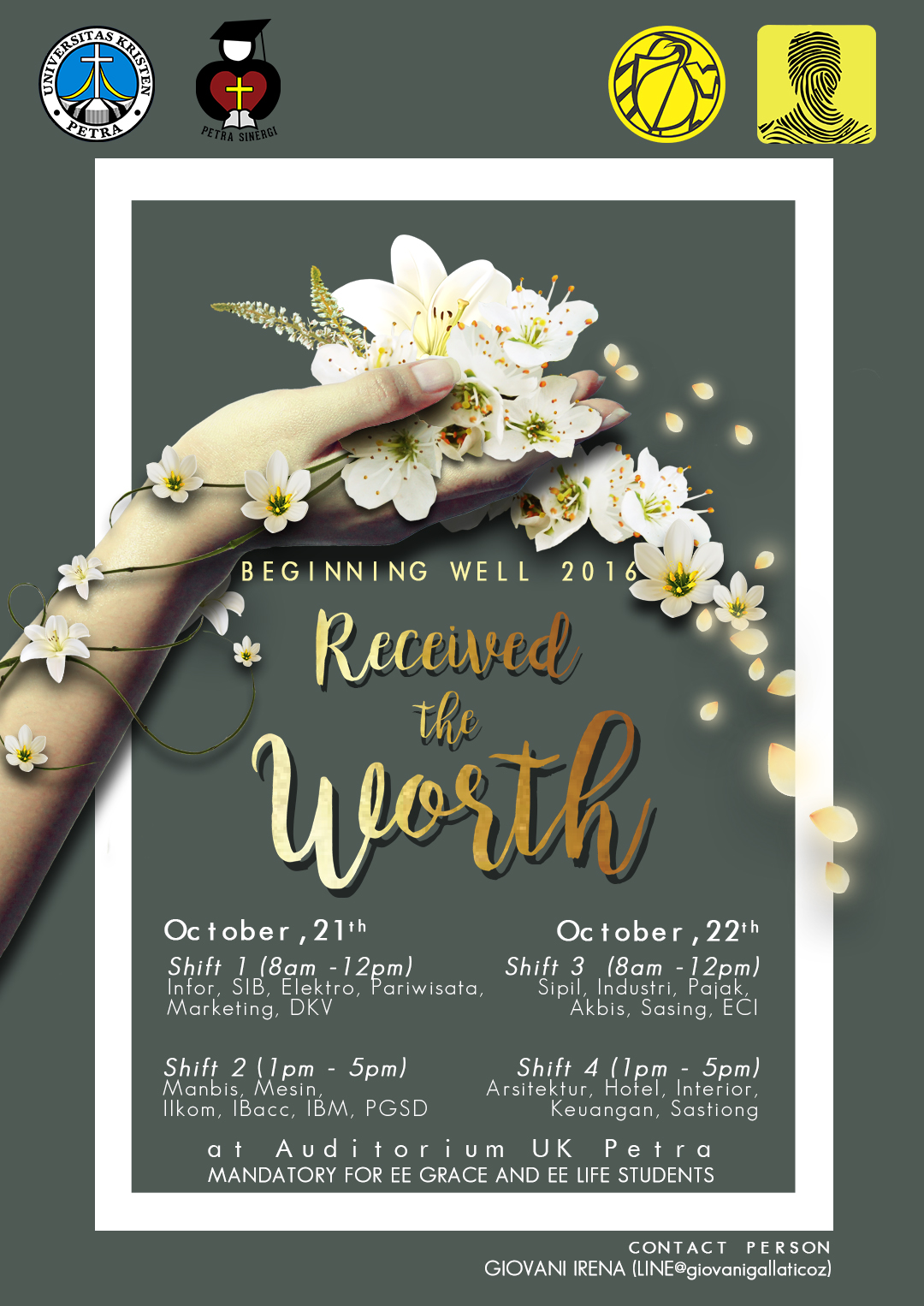 Tim Petra Sinergi UK Petra mengadakan kebaktian "Beginning well 2016: received the worth" pada tanggal 21-22 Oktober 2016 di Auditorium UK Petra.