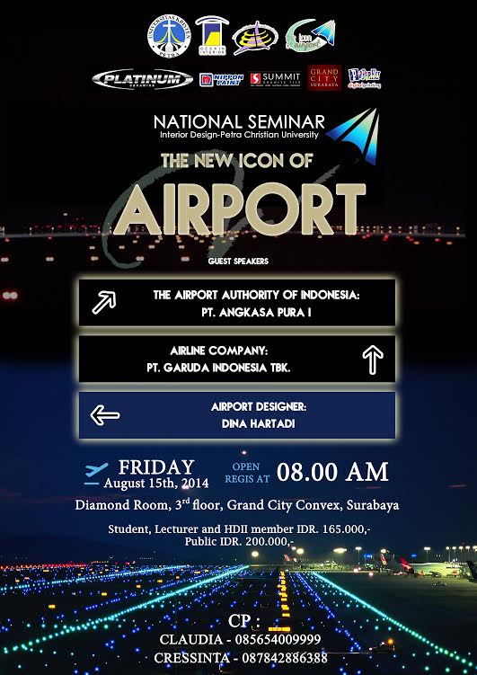 Seminar Nasional Desain Interior yang bertemakan The New Icon of Airport dilaksanakan pada hari Jumat, 15 Agustus 2014 di Diamond Room, lantai 3, Grand City Convex Surabaya. Dengan biaya sebesar Rp 200.000 untuk masyarakat umum dan Rp 165.000 untuk Mahasiswa, Dosen dan HDII, Seminar Nasional desain interior UK Petra ini mengundang PT. Angkasa Pura I, PT. Garuda Indonesia TBK. Dan Dina Hartadi sebagai pembicara.