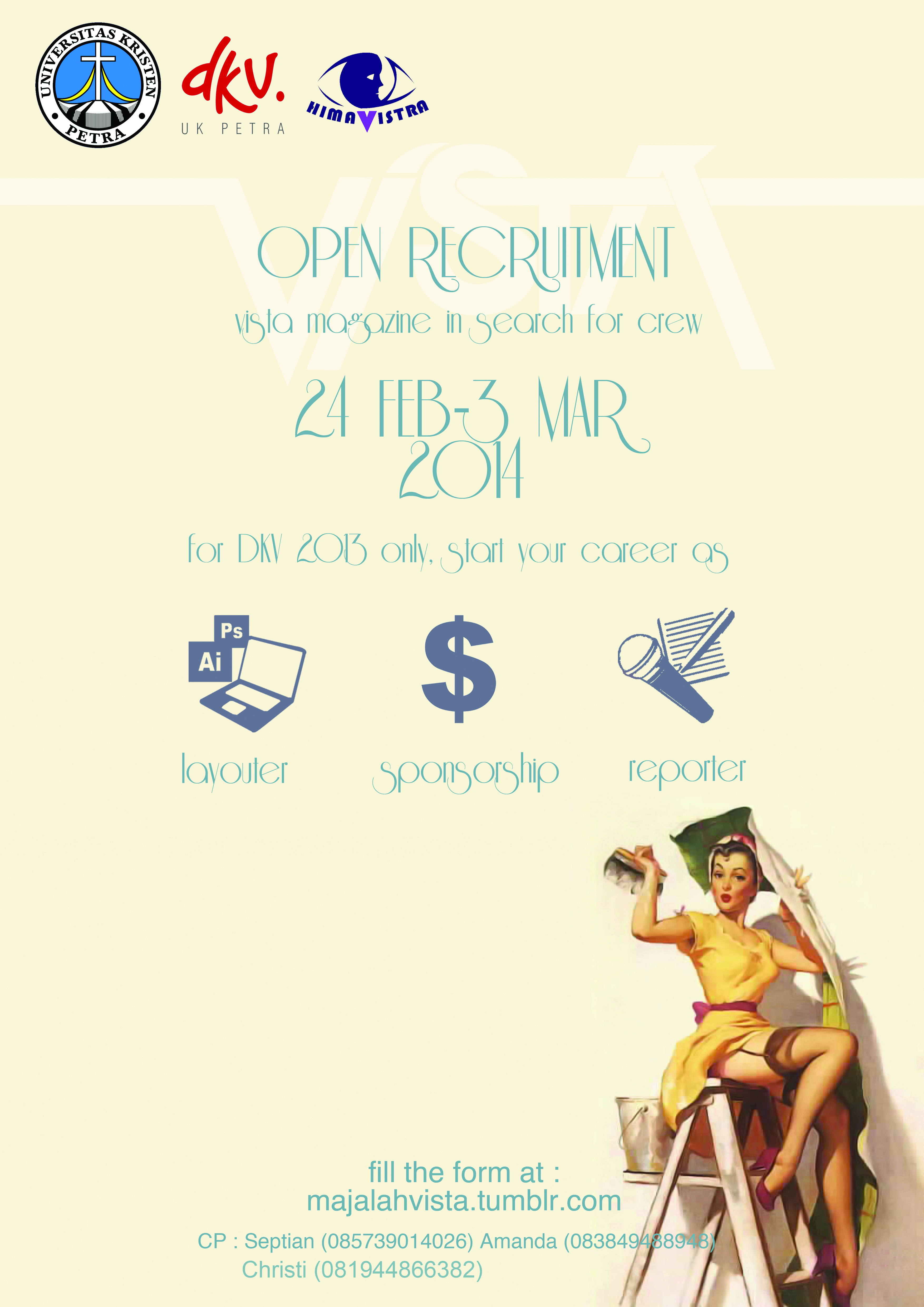 Apakah Nada desainer? artis? fotografer?. Kirimkan karya unik anda ke redaksi.vista@hotmail.com mulai 9 – 20 Mei 2014. Informasi lengkap dapat di akses melalui Majalah Vista di facebook.