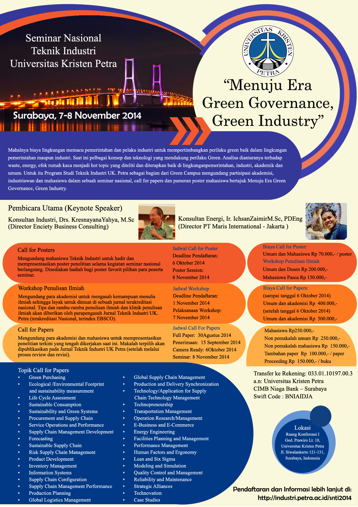 Seminar Nasional bersama Teknik Industri Universitas Kristen Petra, bertajuk “Menuju Era Green Governance, Green Industry”. Kegiatan ini dilaksanakan pada tanggal 7-8 November 2014 dengan menghadirkan Konsultan Energi, Ir. Ichsan Zaimir M.Sc, PDEng dan Pembicara Utama dari Konsultan Industri, Drs. Kresnayana Yahya,M.Sc. Pendaftaran dan informasi lebih lanjut dapat mengunjungi website http://industri.petra.ac.id/snti2014.