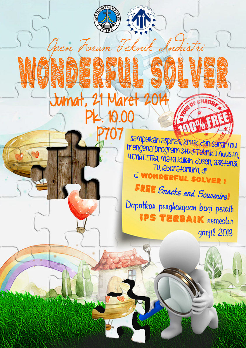 Sampaikan aspirasi kritik dan saranmu mengenai Program Teknik Industri, Himaitra, mata kuliah, dosen, asistensi, TU, laboratorium, dll di open forum teknik industri yang mengangkat tema "Wonderful Solver". Dapatkan juga penghargaan bagi peraih IPS Terbaik semester ganjil 2013. Kegiatan ini dilaksanakan pada hari Jumat, 21 Maret 2014 pada pukul 10.00 WIB di P707 UK Petra.
