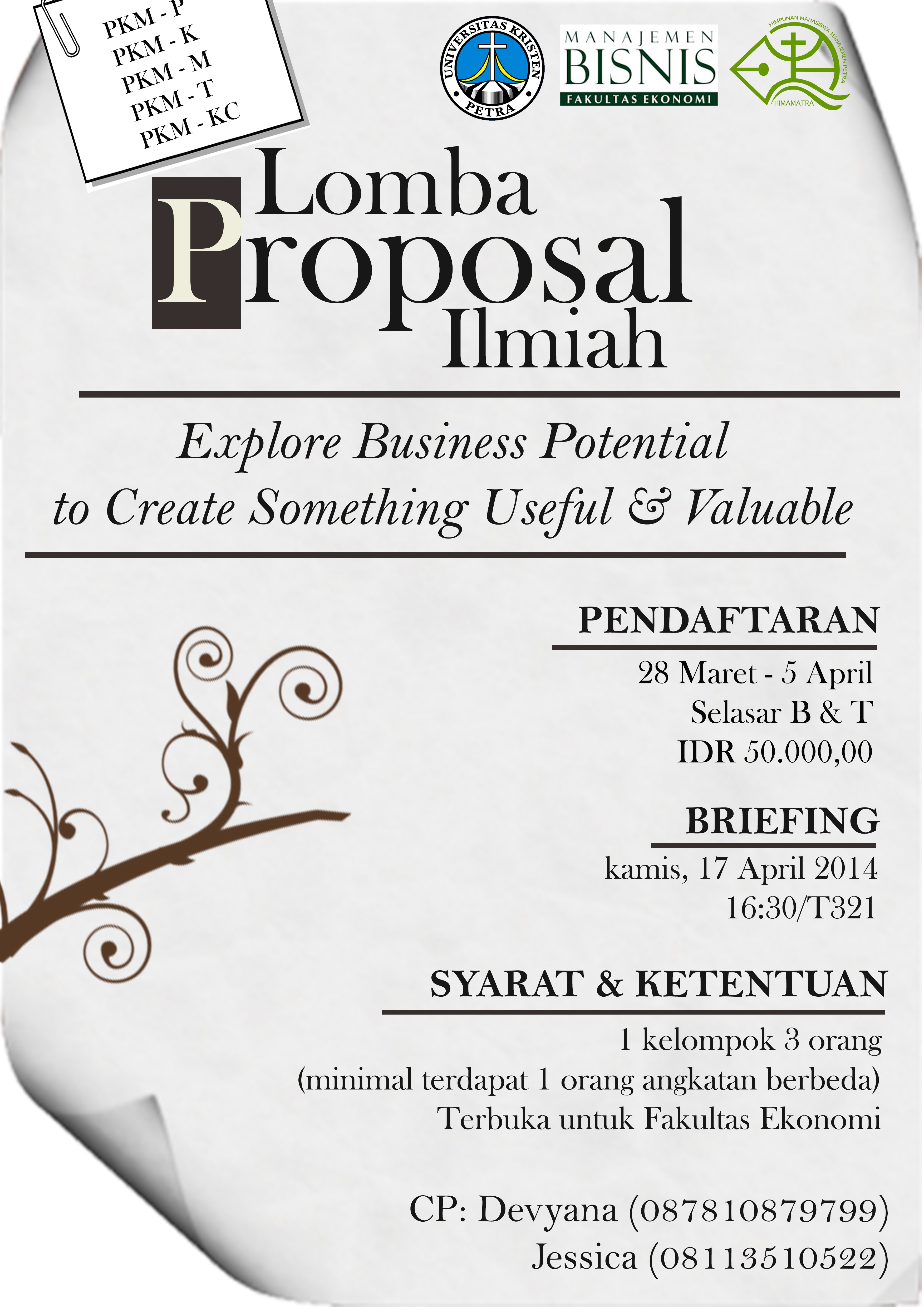 Program Studi Manajemen Bisnis UK Petra mengadakan lomba proposal ilmiah dengan tema Explore Business Potential to Create Something Useful & Valuable. Pendaftaran dibuka pada 28 Maret – 5 April di selasar B & T dengan biaya Rp 50.000. Briefing dilaksanakan pada hari Kamis, 17 April 2014 pada pukul 16.30 WIB di T321 UK Petra. Syarat dan ketentuan berlaku, untuk informasi lebih lanjut dapat menghubungi Devyana (087810879799) atau Jessica (08113510522).