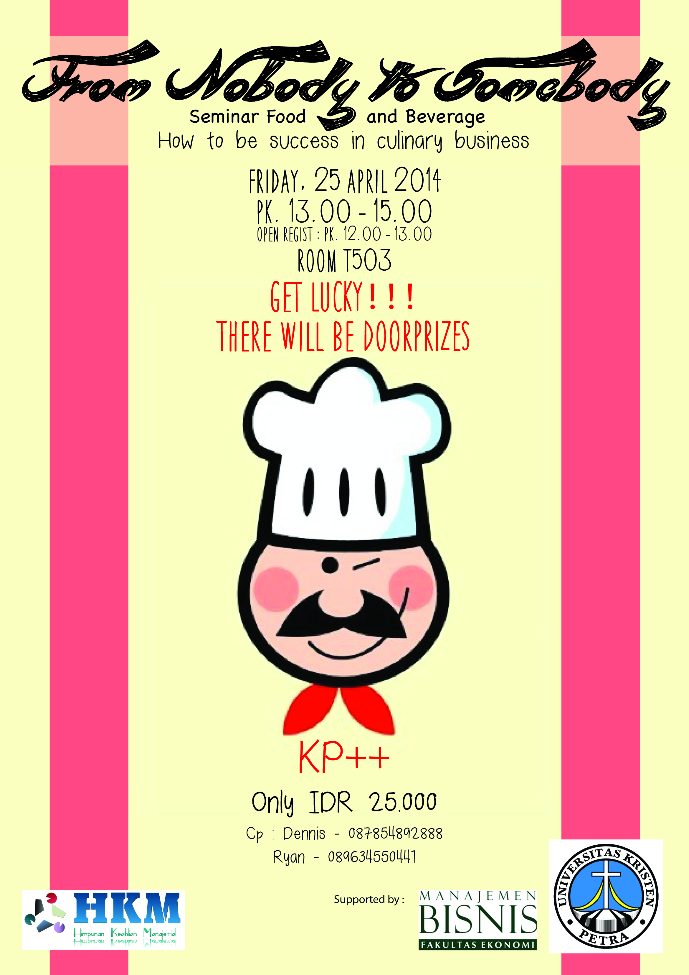 Seminar bertajuk “From Nobody to Somebody” ini dilaksanakan oleh Program Studi Manajemen Bisnis UK Petra. Seminar ini akan membahas tentang food and beverage, bagaimana seseorang membangung bisnis kuliner hingga sukses. Kegiatan dilakukan pada hari Jumat, 25 April 2014 pada pukul 13.00-15.00 WIB. Registrasi dibuka pada 12.00-13.00 dengan biaya registrasi sebesar Rp 25.000.