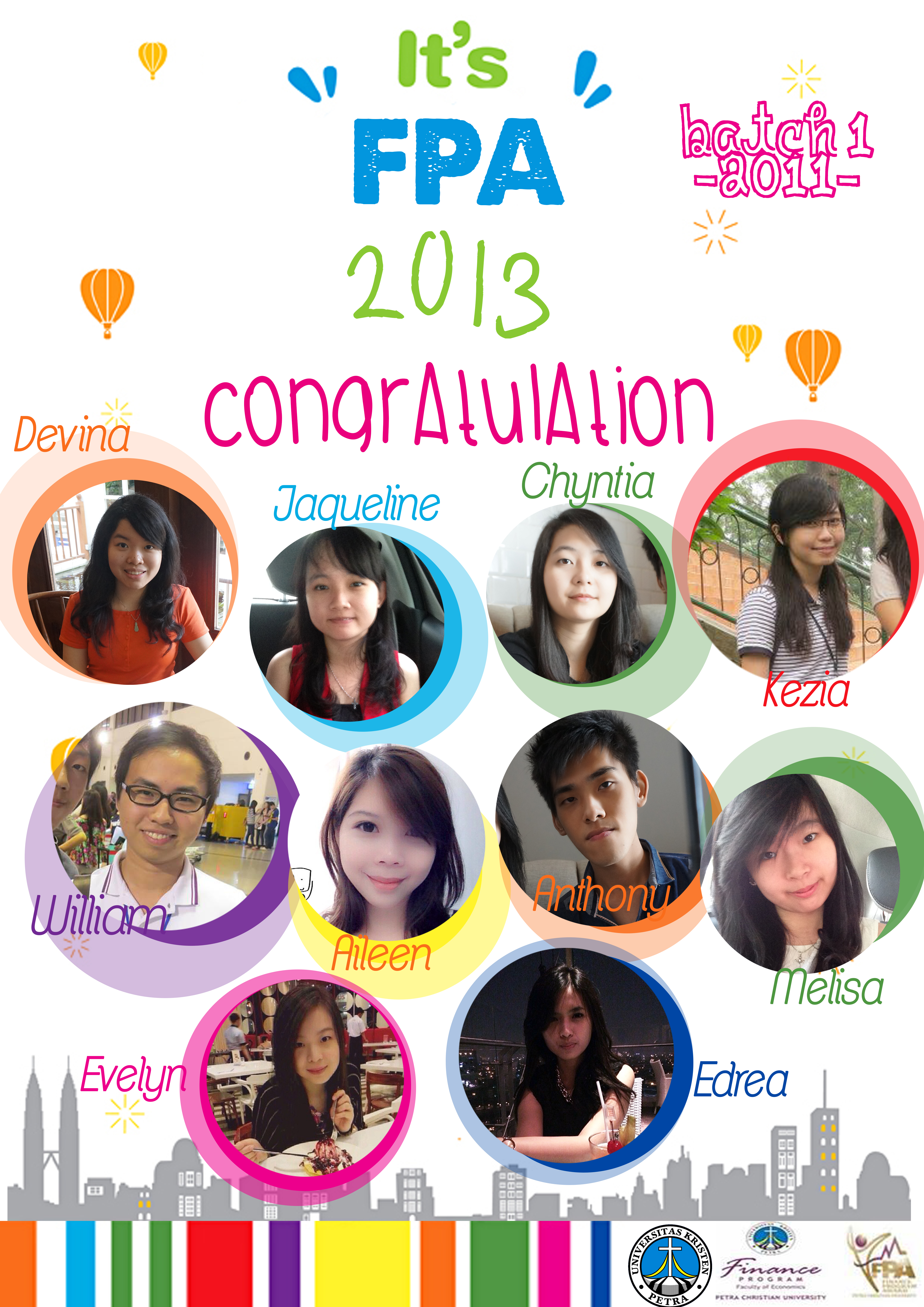 FPA 2013, Selamat kepada Mahasiswa Manajemen Keuangan angkatan 2011 Devina, Jaqueline, Cynthia, Kezia, Wiliam, Aileen, Anthony, Melisa, Evelyn, dan Edrea.
