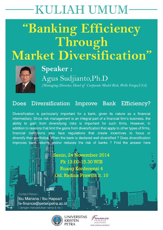 Program Studi Manajemen Keuangan UK Petra mengadakan kuliah umum bertemakan “Banking Efficiency Through Market Diversification” bersama Agus Sudjianto, Ph.D sebegai pembicara. Kuliah dilaksanakan pada hari Senin, 24 November 2014 di Ruang Konferensi IV pada pukul 13.00-15.30 WIB. Informasi lebih lanjut dapat menghubungi Ibu Mariana / Ibu Hapsari, atau dapat mengirimkan email ke fe-finance@peter.petra.ac.id dengan menyebutkan nama dan nrp.